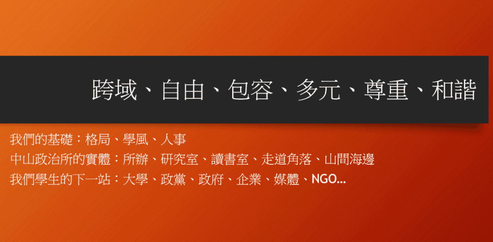 「國立中山大學政治學研究所」為台灣政治學界獨具特色的學術單位。座落於悠美的西子灣,面山擁海以及自由跨域的學術環境,自1993創立以來培育許多大格局的政治家、企業家、教育家及慈善家。