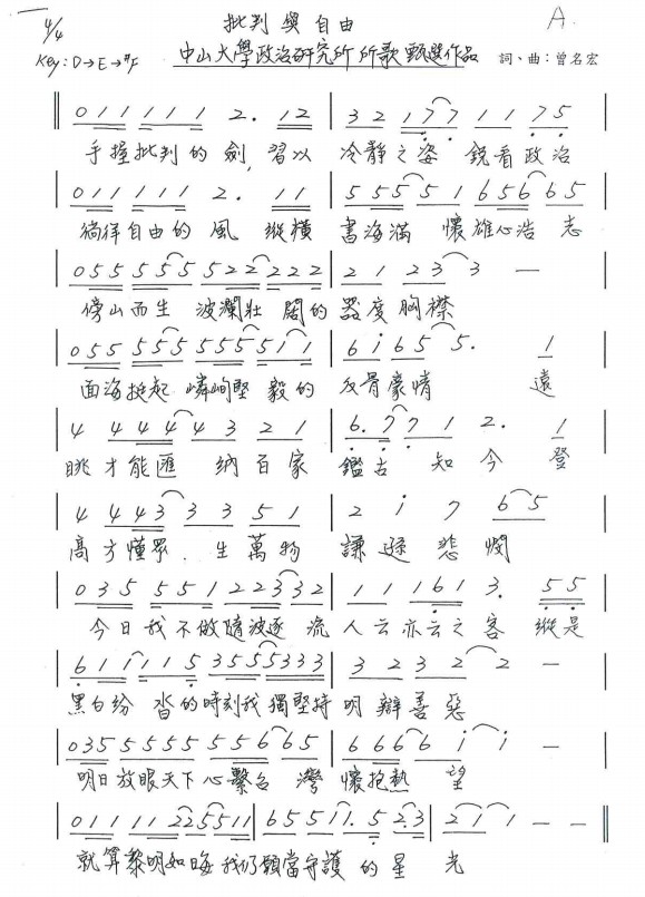 「所歌的誕生過程源自一段美麗的插曲。」廖老師於2003年擔任本所第五任所長時,某次因公前往屏東台電公司,擔任行政院研考會服務品質獎章評鑑委員,因緣際會認識了由中山企管系畢業的中華電信人員校友曾名宏先生。廖老師聽聞曾學長曾經替企管系創作過系歌之後,便下定決心效法。她在 2010年11月13日舉辦公開的所歌徵選活動。依據當時政治所務會議立下的徵選辦法,最終優勝者將獲頒兩萬元獎金。徵選活動吸引所內外的投稿人踴躍嘗試,最終在所內師生共同評選和投票過程中,由曾名宏學長創作的「批判與自由」歌曲獲選。自此誕生這首膾炙人口的所歌,並成為歷代政治所學會和師生間相互傳唱的政治所代表歌曲。廖達琪教授補充道:,這首歌的詞曲演唱配樂全由曾學長一手包辦。「該首歌的詞曲都是取材自政治所的文宣資訊,撰寫配樂乃至演唱都是由創作者獨力完成」。