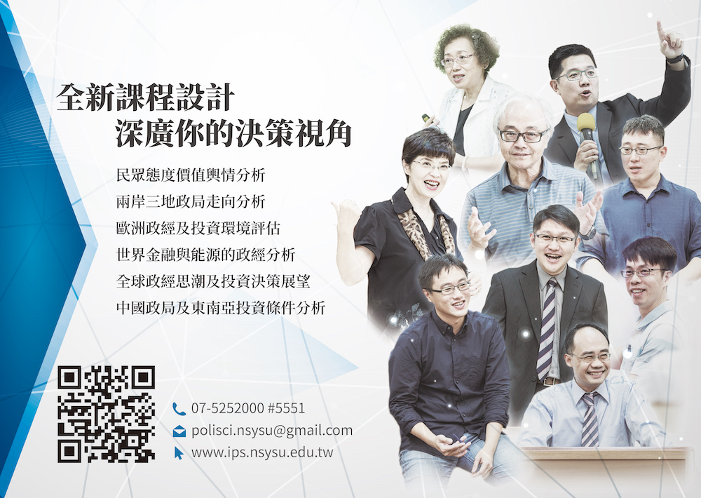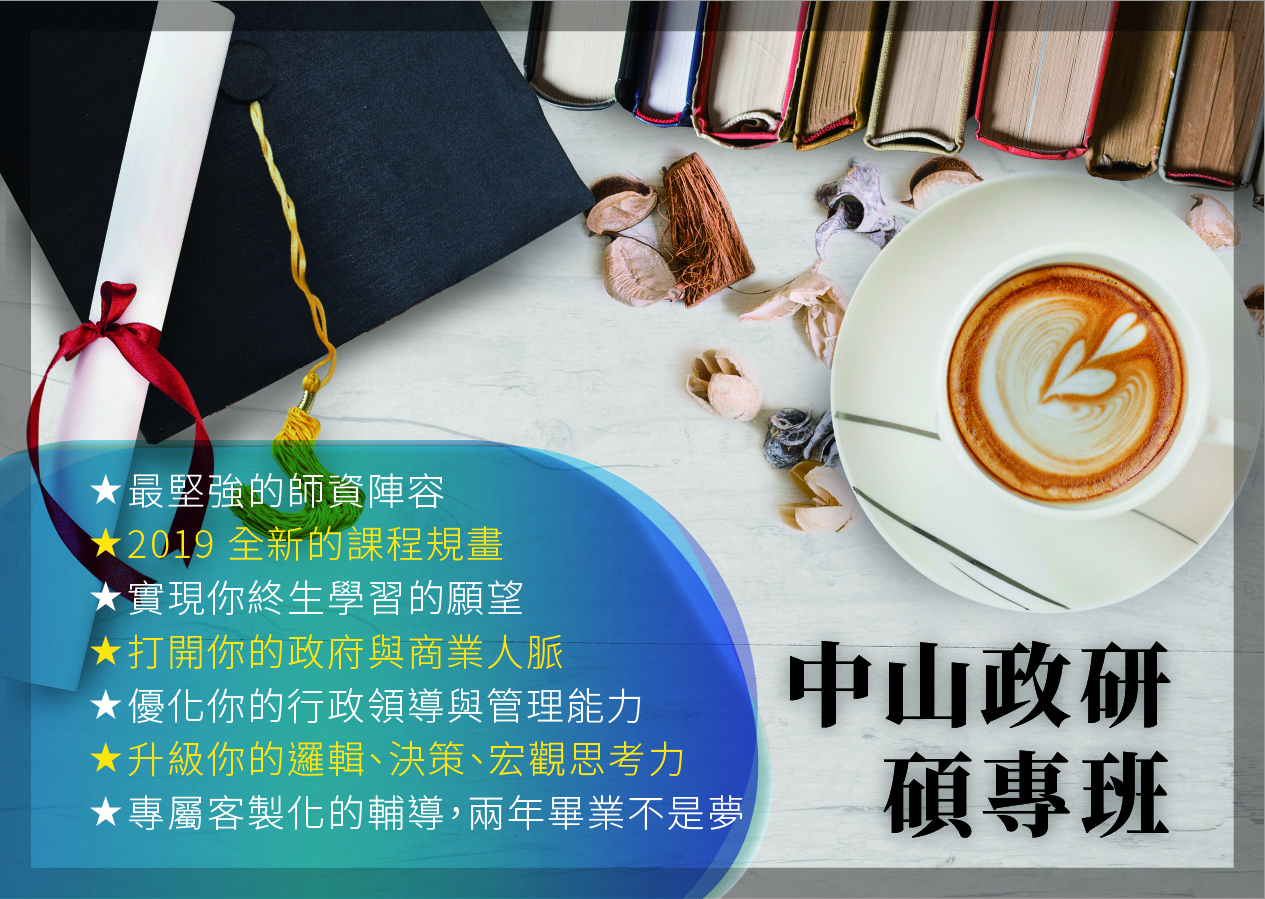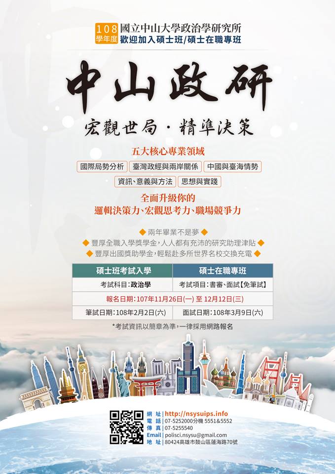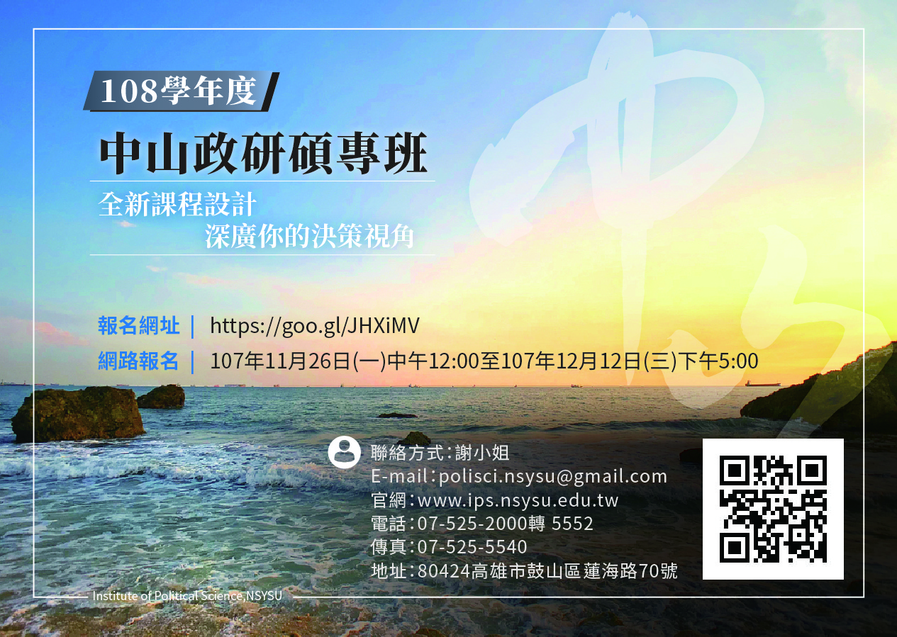 【唸碩士成就自己 唸政治造福人群】接下來的關鍵10年,為人民謀福將會與為企業增值一樣重要。歡迎對政治有興趣有想法的您,報考中山大學政治學研究所108學年度碩士班/在職專班!