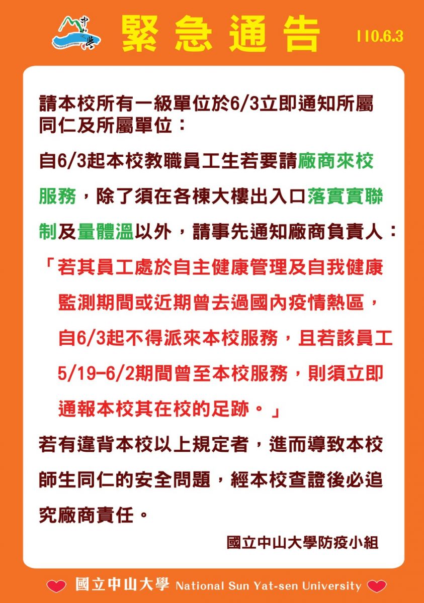 國立中山大學嚴重特殊傳染性肺炎防疫工作小組 敬上