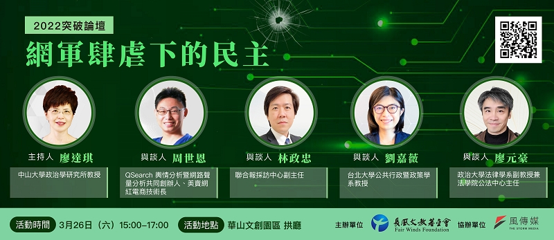 本次論壇邀請中山大學廖達琪教授、QSearch數據分析公司周世恩共同創辦人兼技術長、聯合報採訪中心林政忠副主任、台北大學公共行政學系劉嘉薇教授、政治大學法律系廖元豪副教授,從各種角度切入,剖析網軍如何操作情緒、破壞民主,以及我們應當如何對抗網軍的肆虐。誠摯邀請您一起來探討!