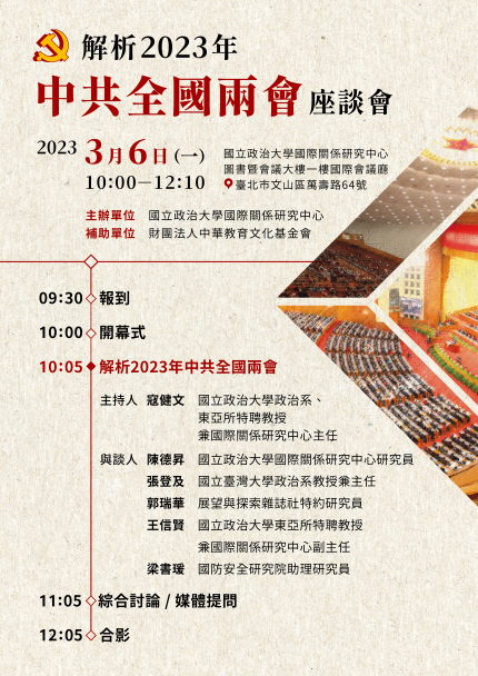 簡介:中共第十四屆中國人民政治協商會議全國委員會會議、中國全國人民代表大會第一次會議分別於3月4日、5日在北京召開,除進行工作報告外,並選出新一屆國家正副主席、國務院正副總理、國務委員、各部部長、中央軍委主席、全國政協主席、全國人大委員長等高層人事職務,此將牽動未來中共黨政、經濟、社會、外交、軍事、兩岸關係等各方發展,備受國內外關注。故政大國關中心舉辦本次座談會,邀請專家學者分析可能的意涵與未來走向,希望能夠即時性地對中共全國兩會進行全面性解析。