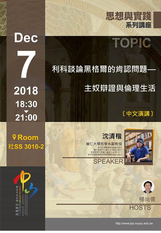 講題:利科談論黑格爾的肯認問題-主奴辯證與倫理生活