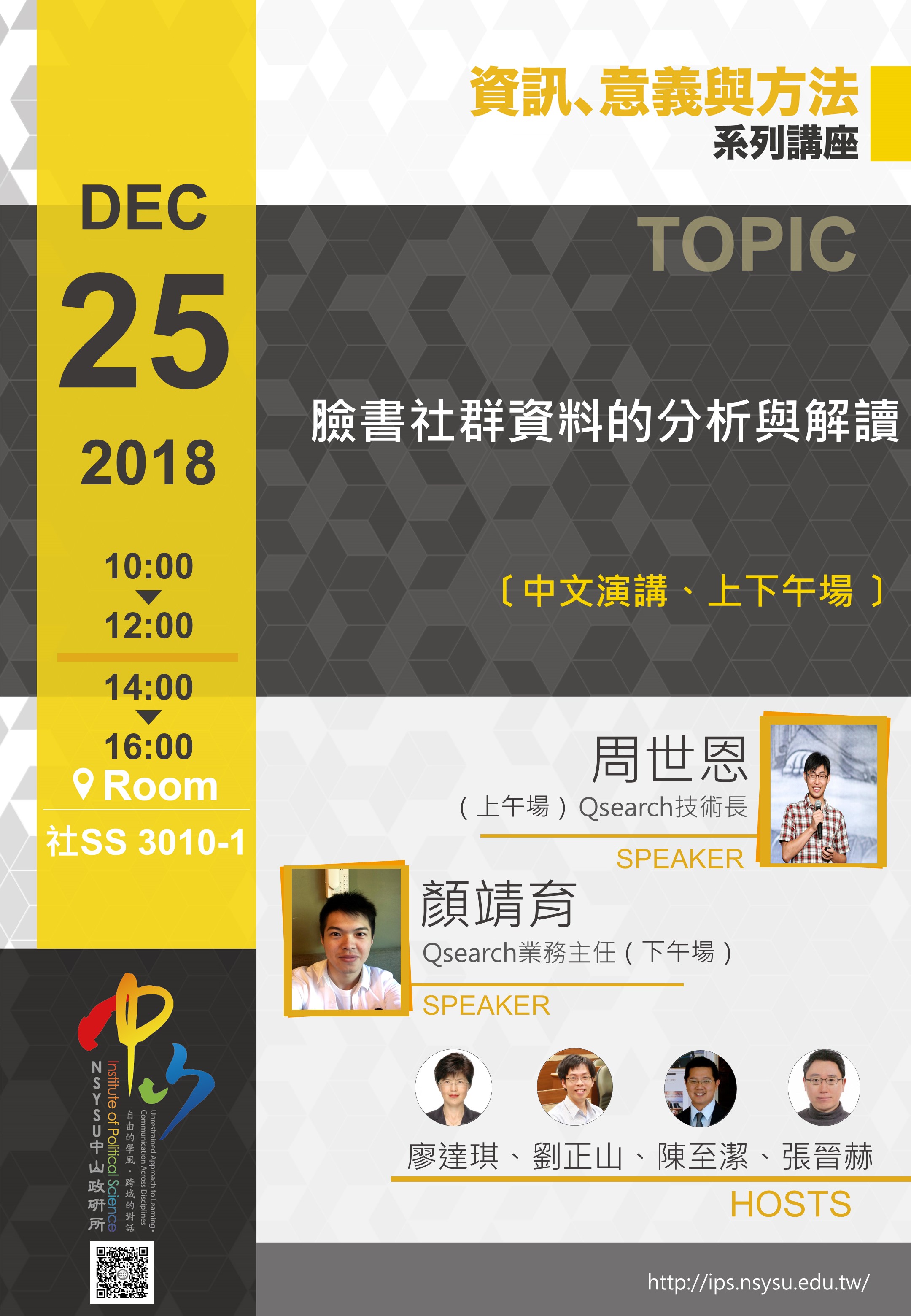 本所擬訂於107年12月25日(二)上午10時00分至12時00分、下午2時00分至4時00分,舉辦兩場「資訊、意義與方法」系列講座,演講資訊如下: