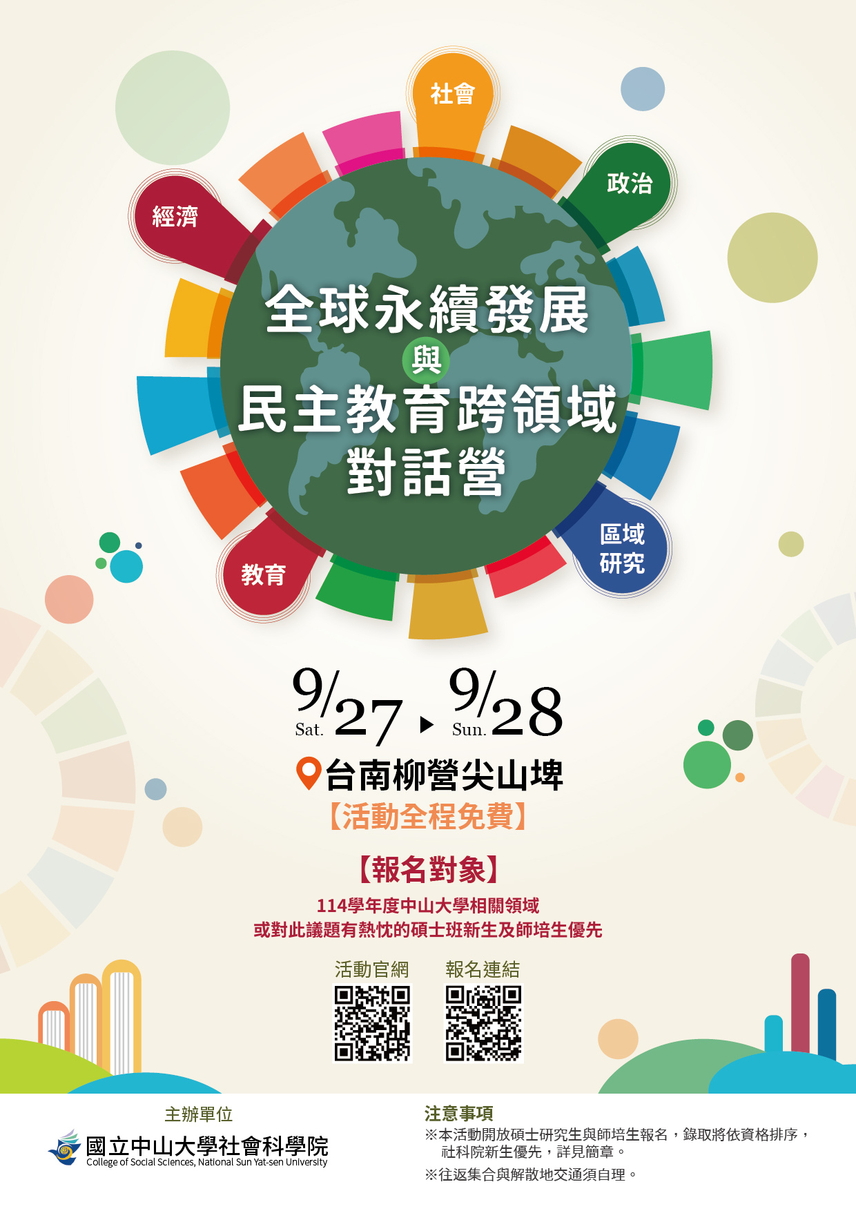 邀請中山社科院教師授課,從政治、社會、經濟到教育視角,帶你從理論到實務,深入認識民主挑戰與教育回應的路徑。