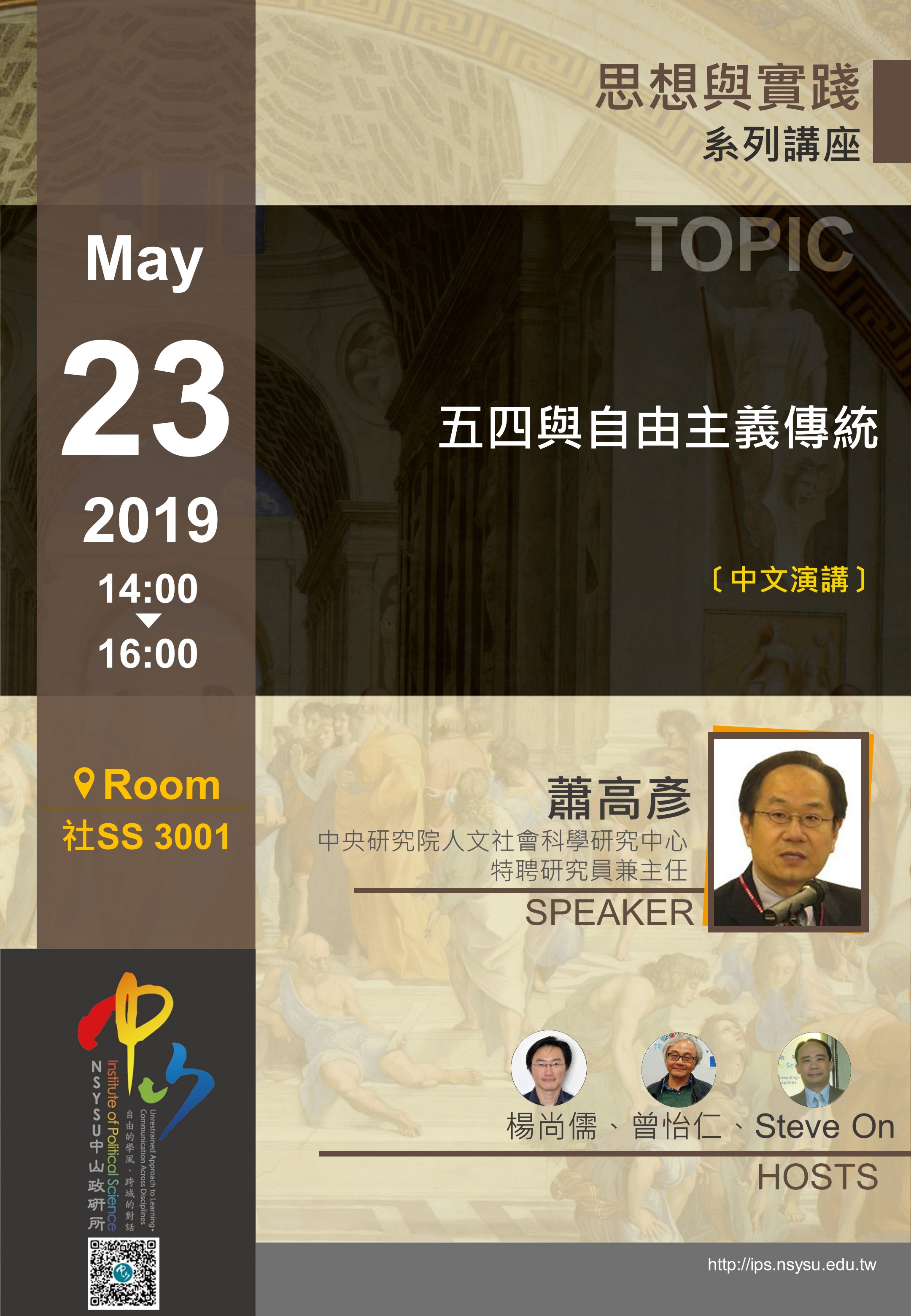 本所訂於2019年5月23日(四)舉辦「思想與實踐」系列講座,演講資訊如下: