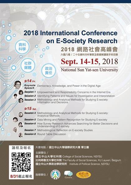 本所將於2018年9月14日(五)至15日(六)在國研大樓1樓華立廳,舉辦「2018網路社會高峰會」,邀請來自比利時、澳洲、美國、日本、韓國、香港等學者,與台灣學者共同討論資料科學的應用、網絡世代政府的責任、資料分析技術等三大重要議題。