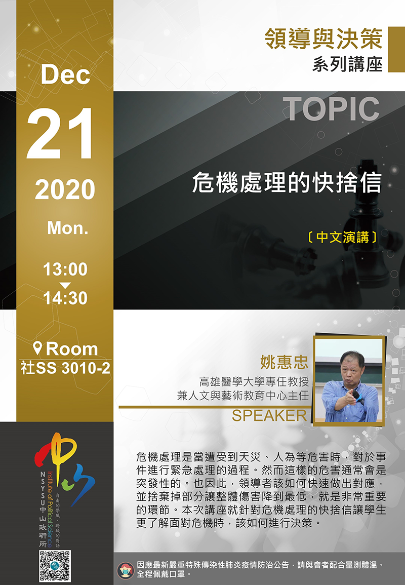 本所將舉辦「領導與決策」系列講座,資訊如下: