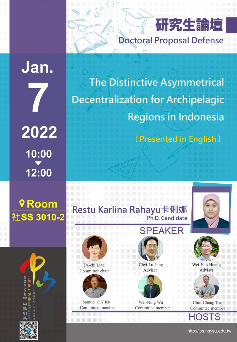 Committee member: Da-chi Liao廖達琪、Samuel C.Y Ku顧長永、Wei-Ning Wu 吳偉寧、Chin-Chang Tsai蔡錦昌 、Chyi-Lu Jang張其祿、Wei-Hao Huang黃韋豪