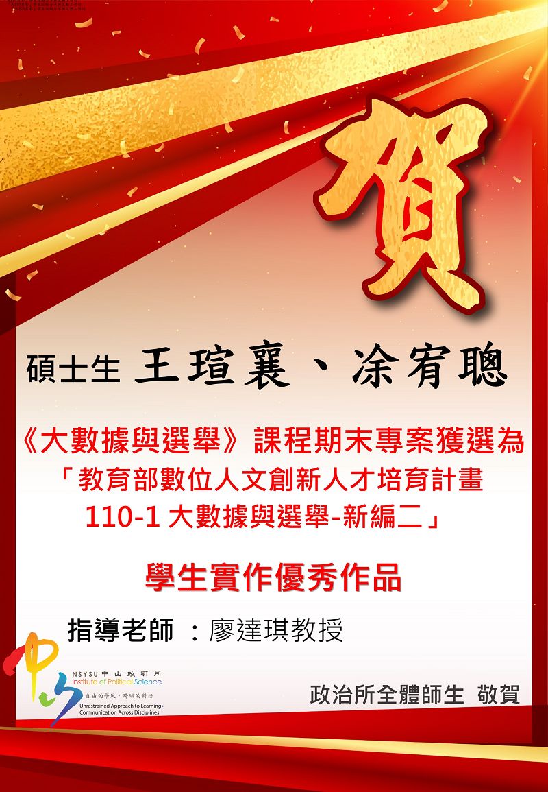 《大數據與選舉》課程期末專案獲選為「教育部數位人文創新人才培育計畫110-1 大數據與選舉-新編二」學生實作優秀作品