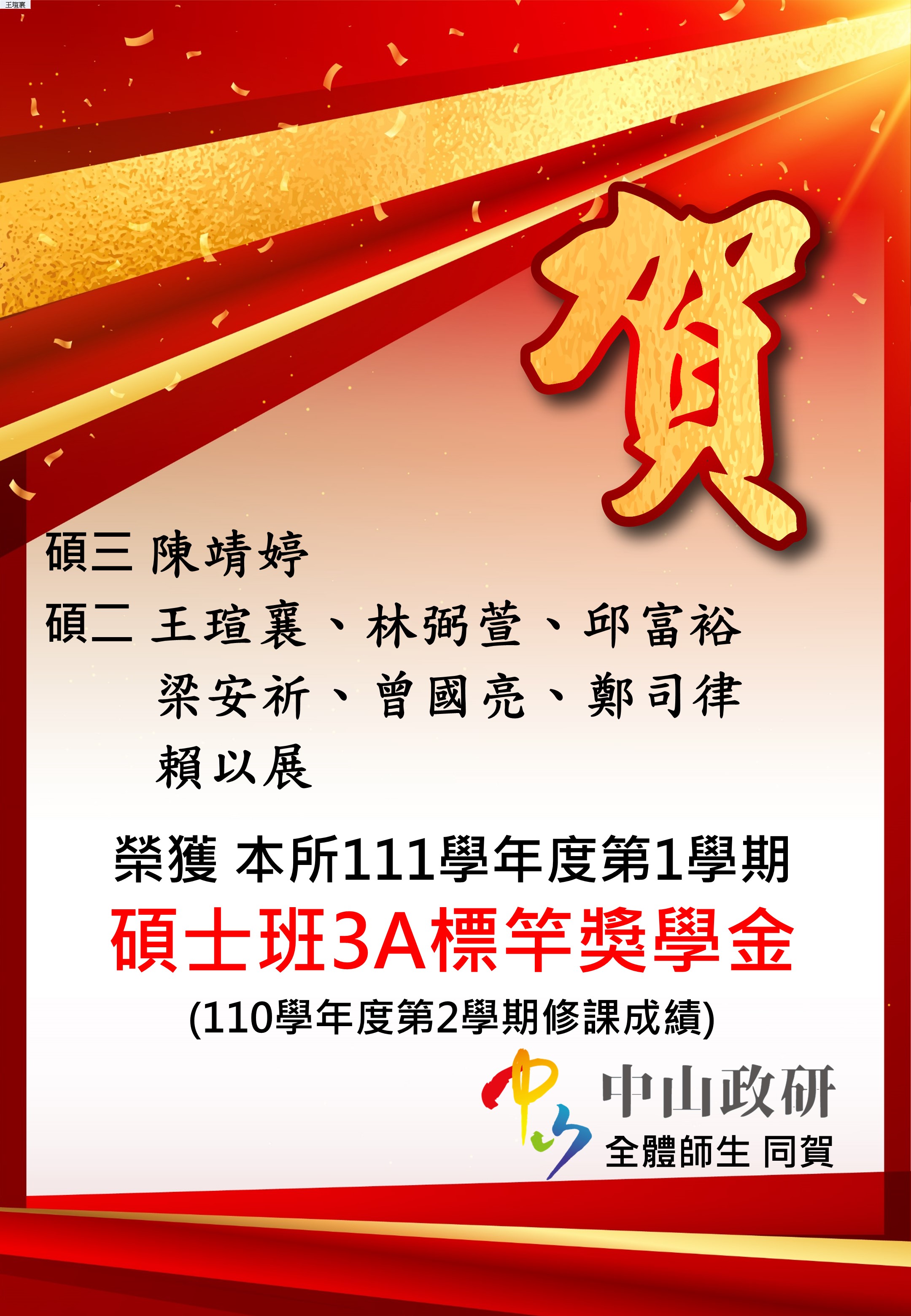 榮獲111-1碩士班3A標竿獎學金!
