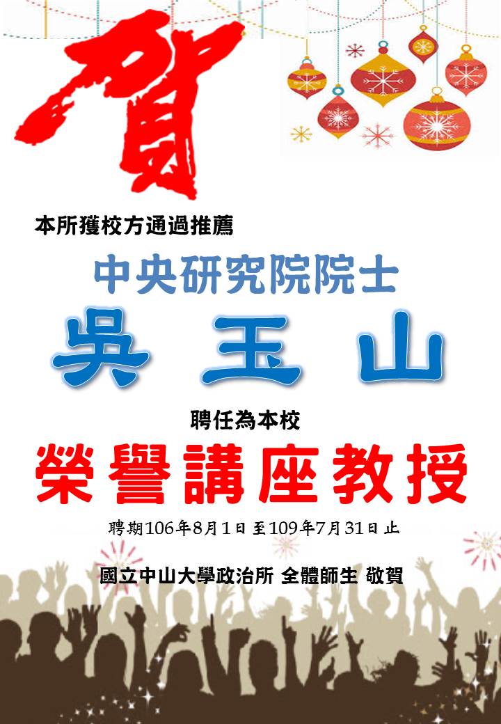 恭賀本所獲校方通過推薦中央研究院院士吳玉山聘任為本校榮譽講座教授