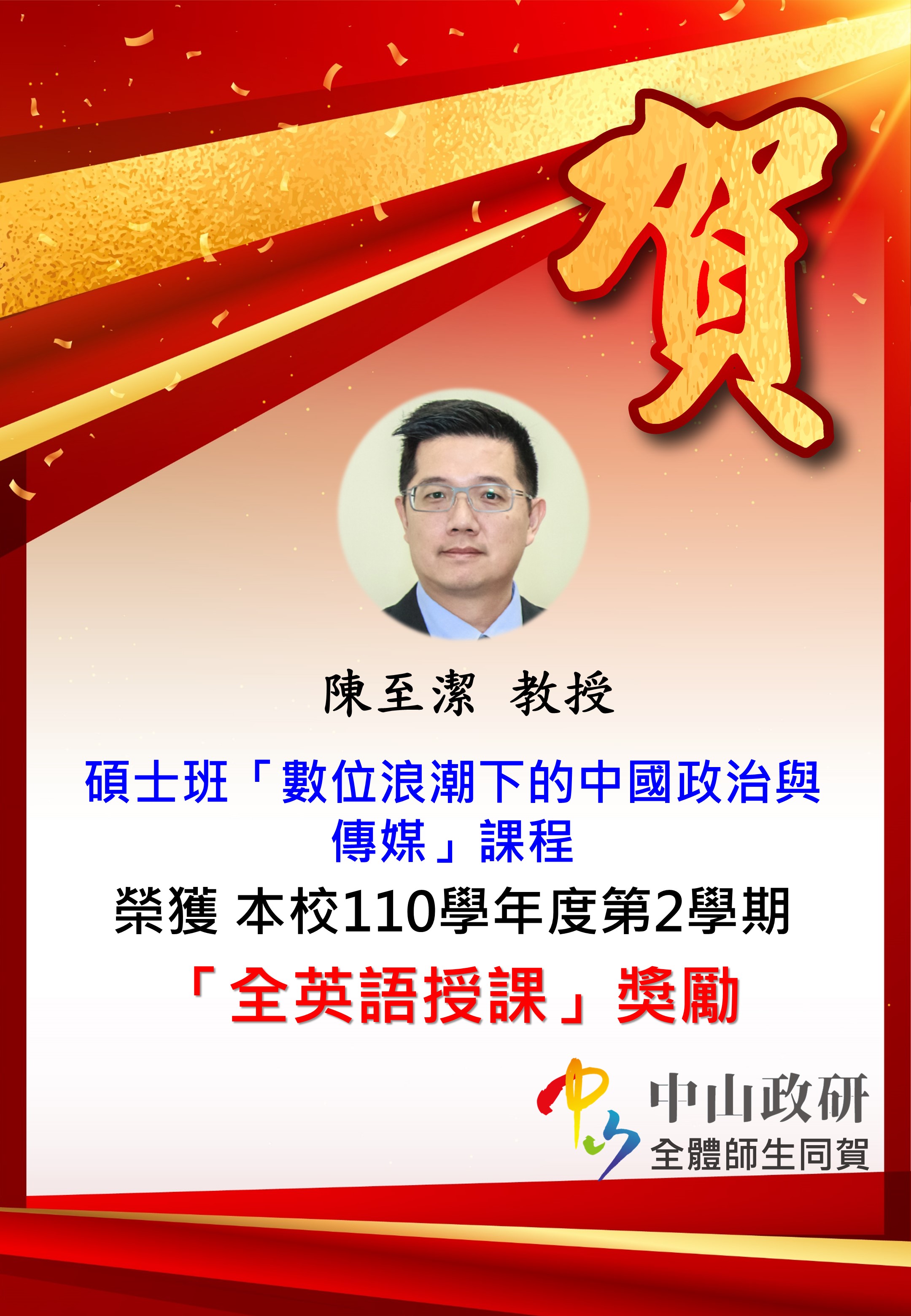 賀本所陳至潔教授獲本校110學年度第2學期「全英語授課」獎勵