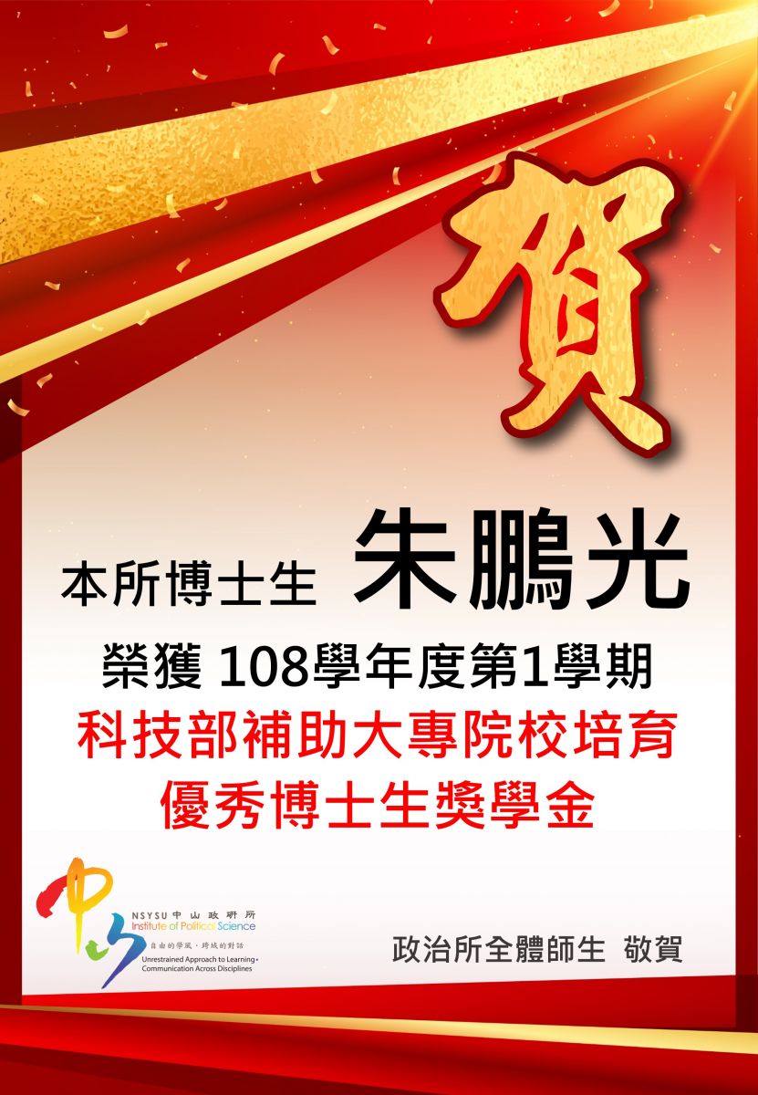 狂賀 本所博士班 朱鵬光同學 榮獲108學年度第一學期科技部補助大專院校培育優秀博士生獎學金!