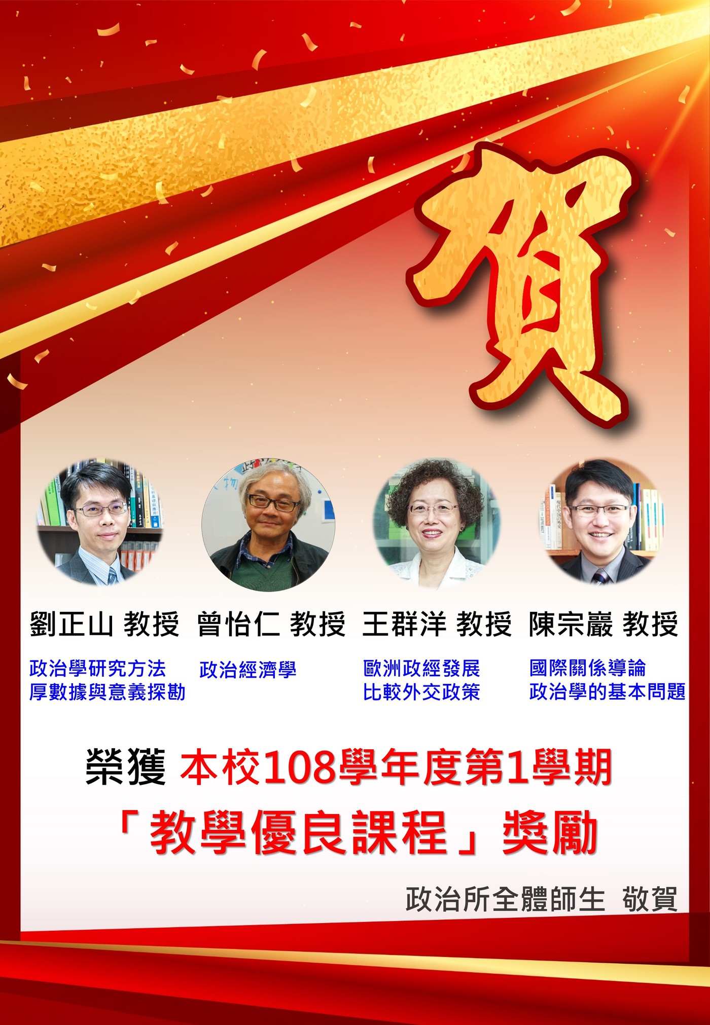 賀本所劉正山、曾怡仁、王群洋、陳宗巖教授獲本校108學年度第1學期「教學優良課程」獎勵