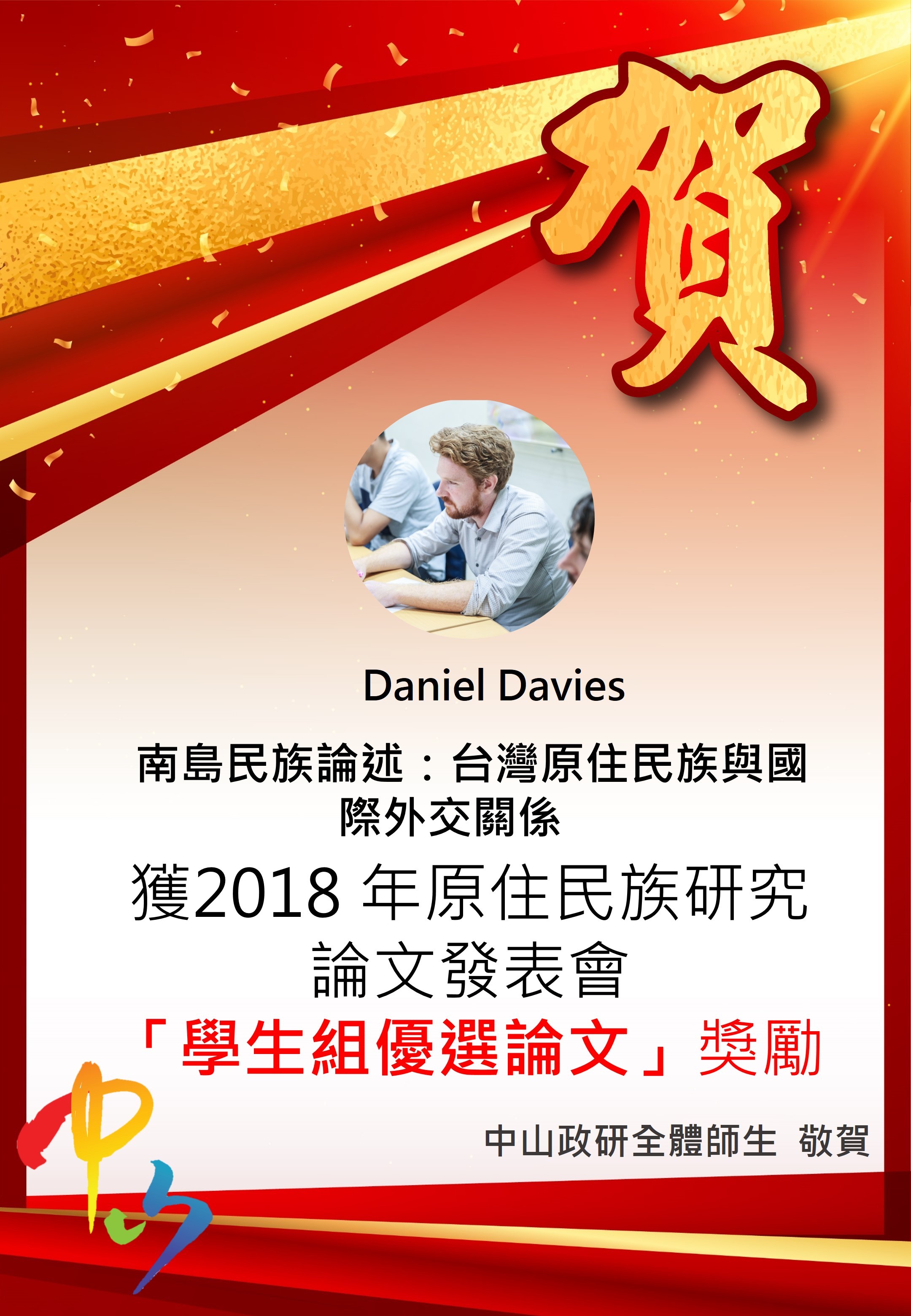 恭賀本所博士生丹尼爾獲2018年原住民族研究論文發表會「學生組優選論文」獎勵