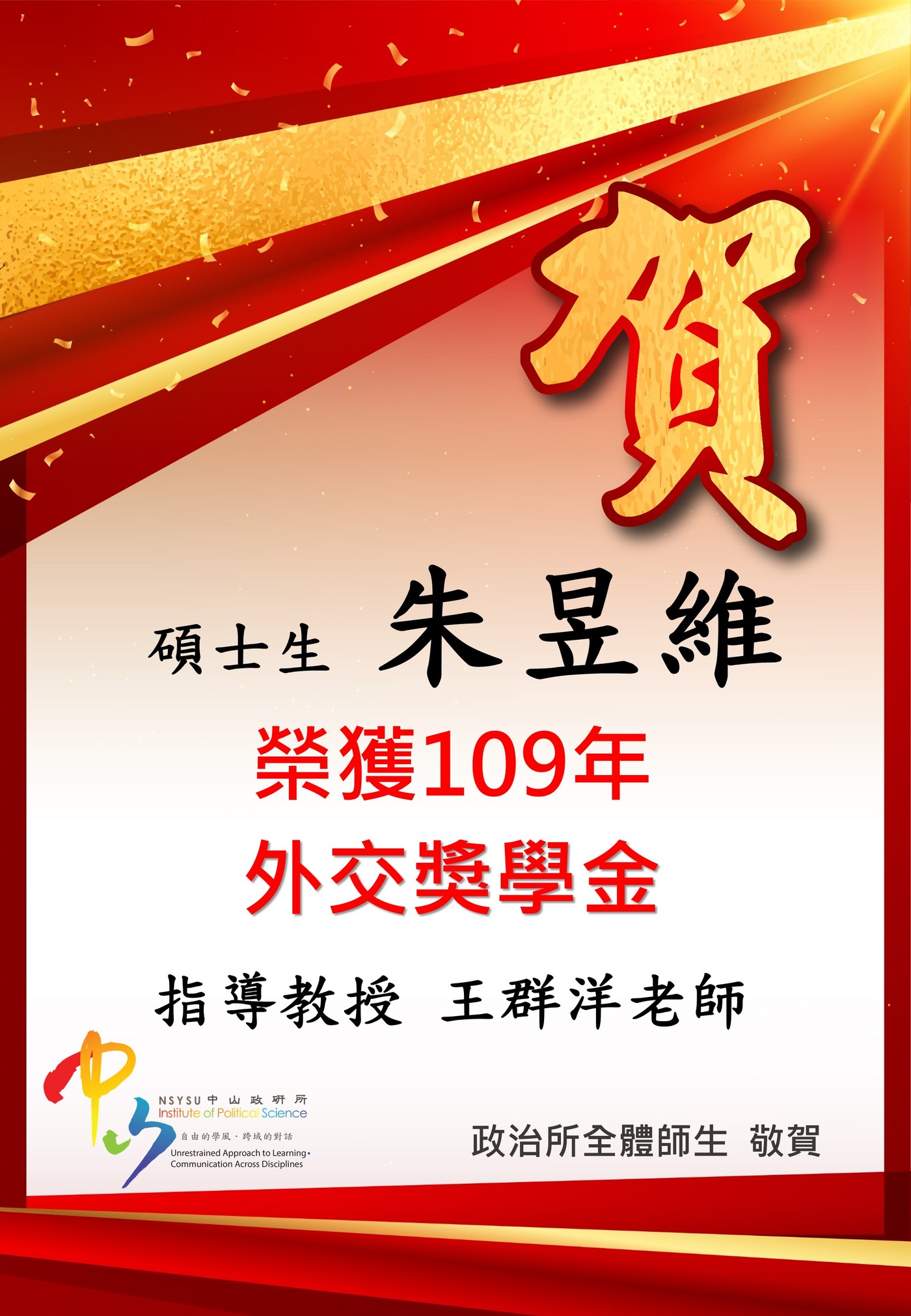恭喜 碩士生朱昱維 榮獲109年外交部獎學金