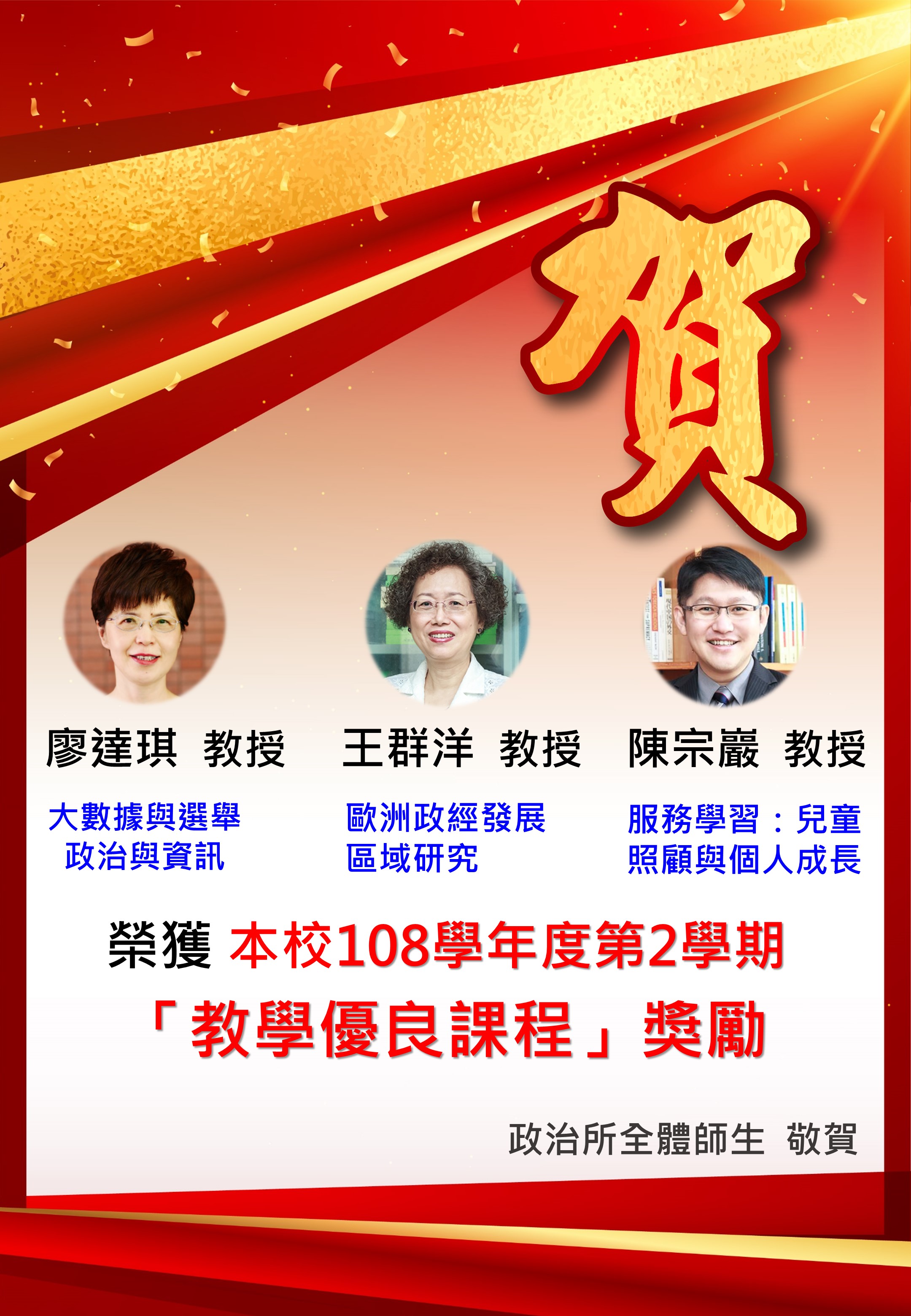 賀本所廖達琪、王群洋、陳宗巖教授獲本校108學年度第2學期「教學優良課程」獎勵