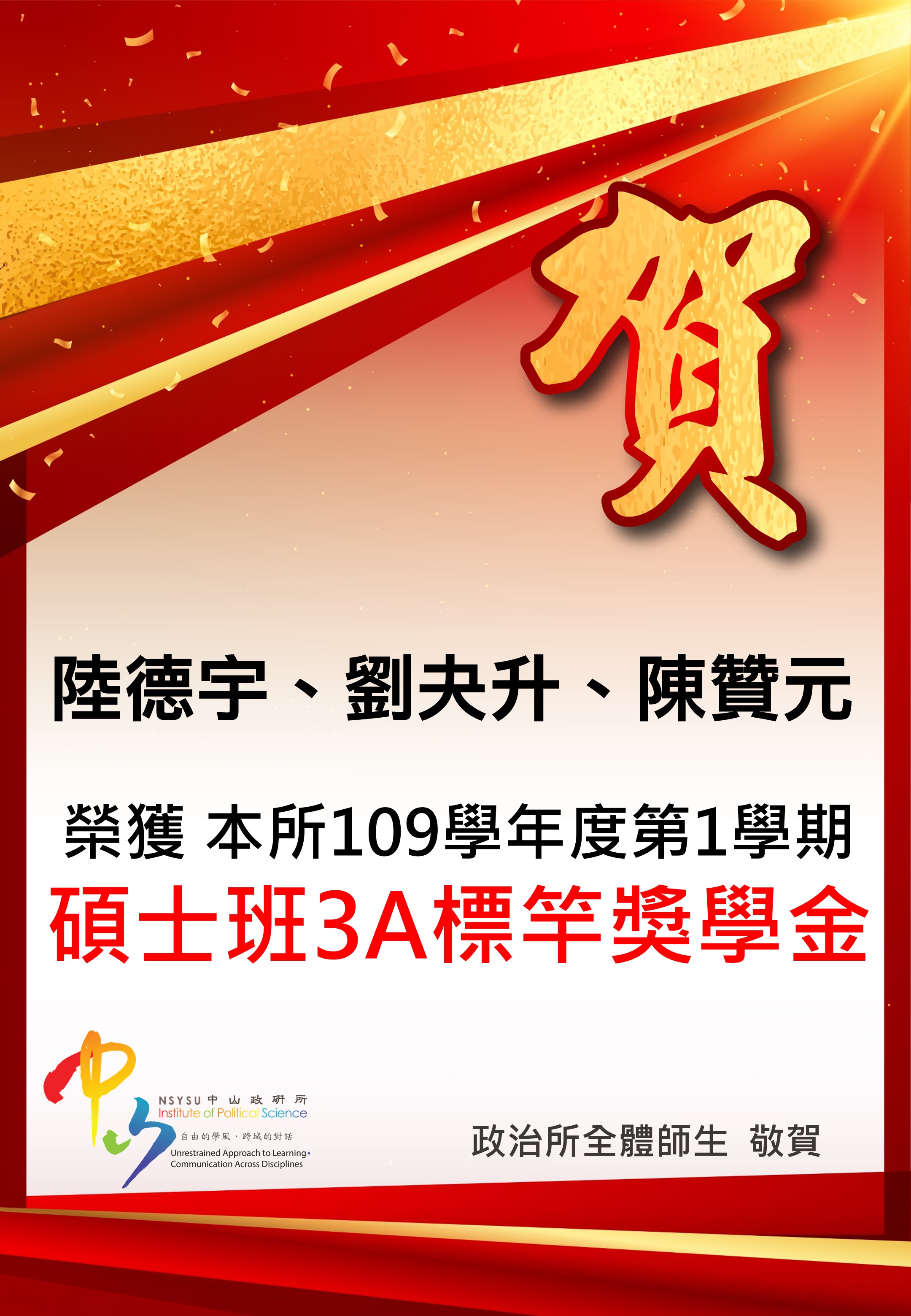 除了每學期在學業上表現優良只要成績達標的3A標竿獎學金5000元,還有歷年在學期間修業成績優秀、對兩岸事務有特別見解政治學相關系所碩博士生。