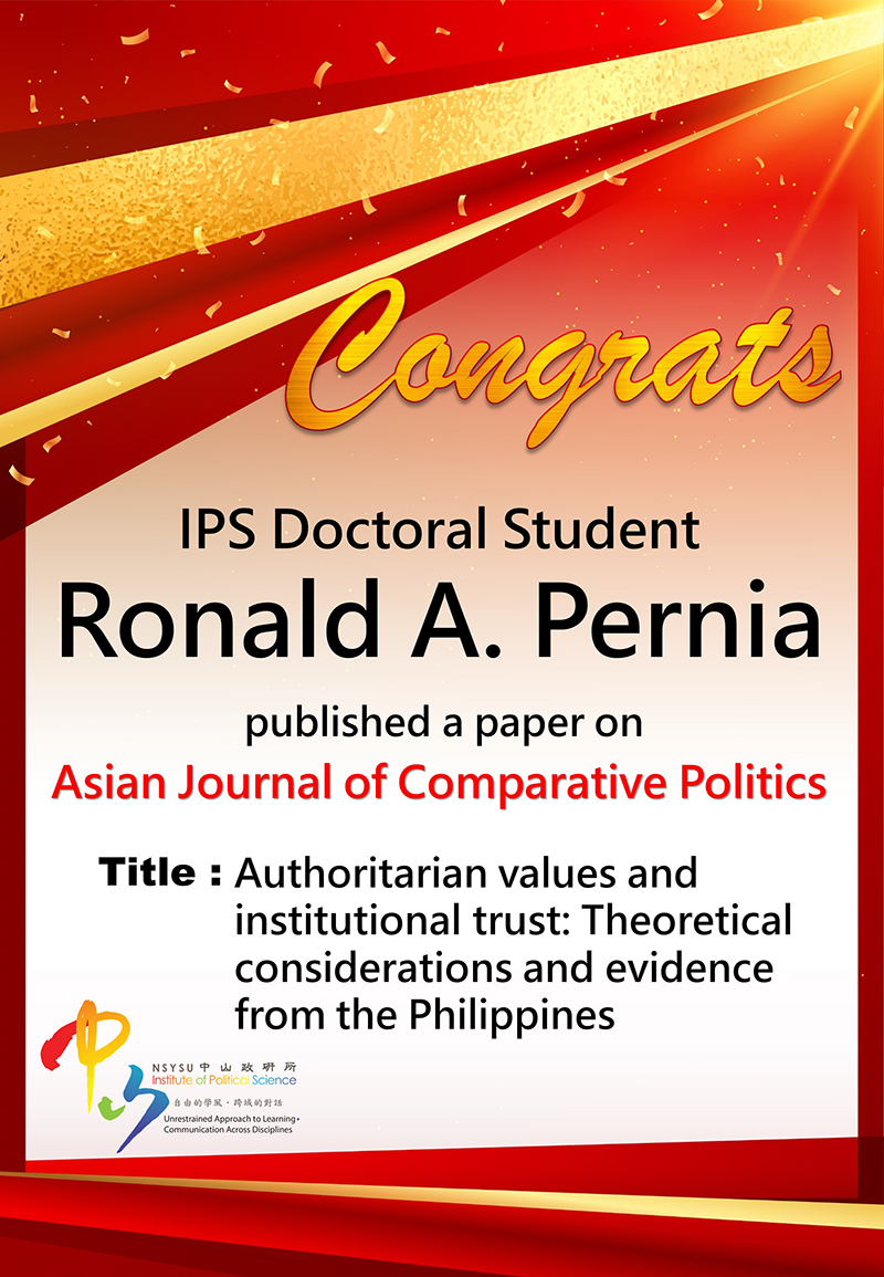 恭賀本所博士生Ronald A. Pernia論文獲刊登Asian Journal of Comparative Politics