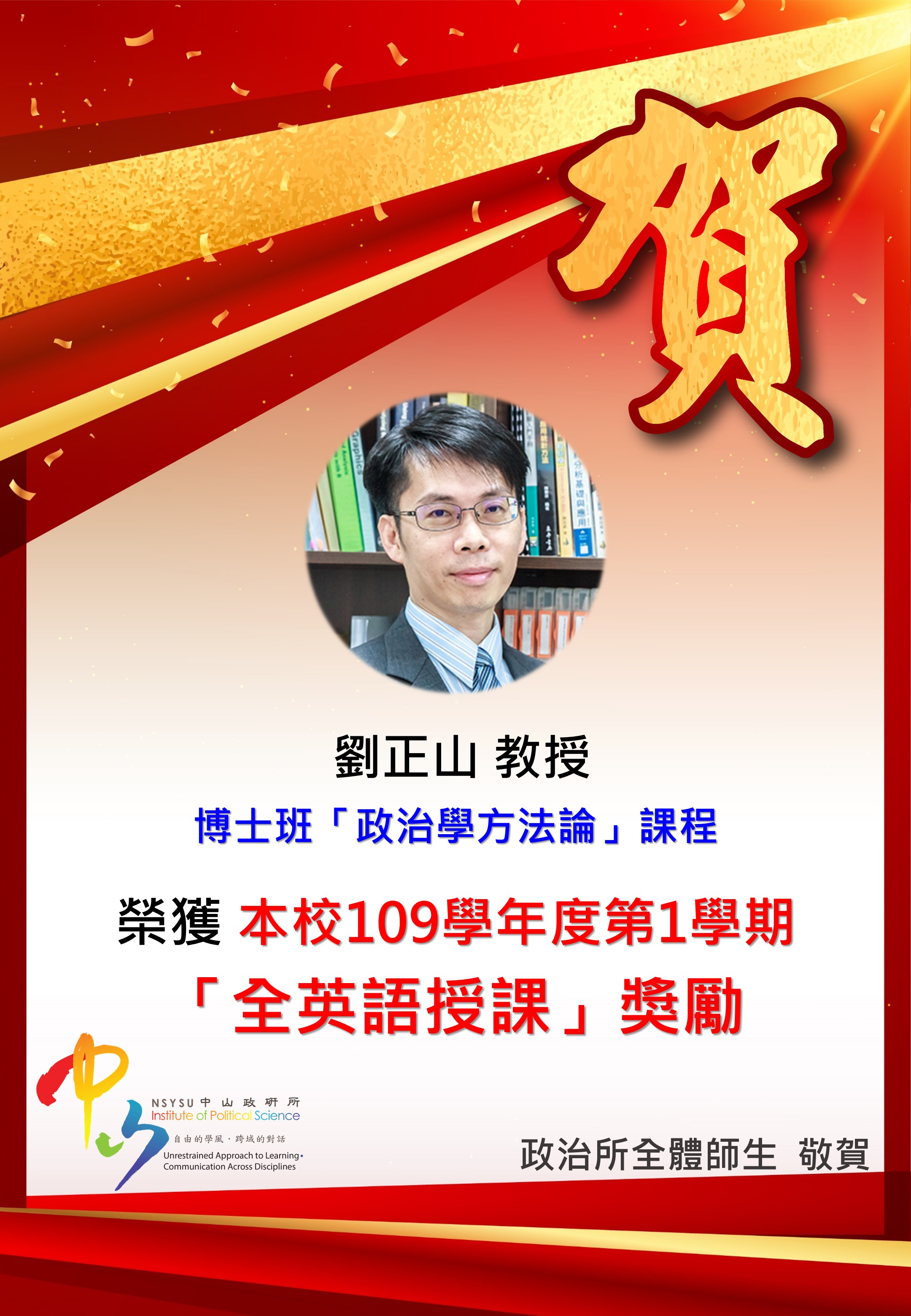賀本所劉正山教授獲本校109學年度第1學期「全英語授課」獎勵