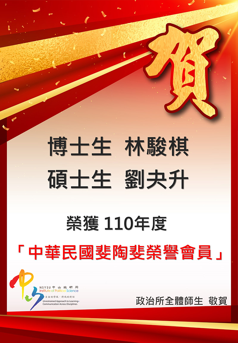 恭賀本所博士生林駿棋、碩士生劉夬升榮獲110年度中華民國斐陶斐榮譽會員。