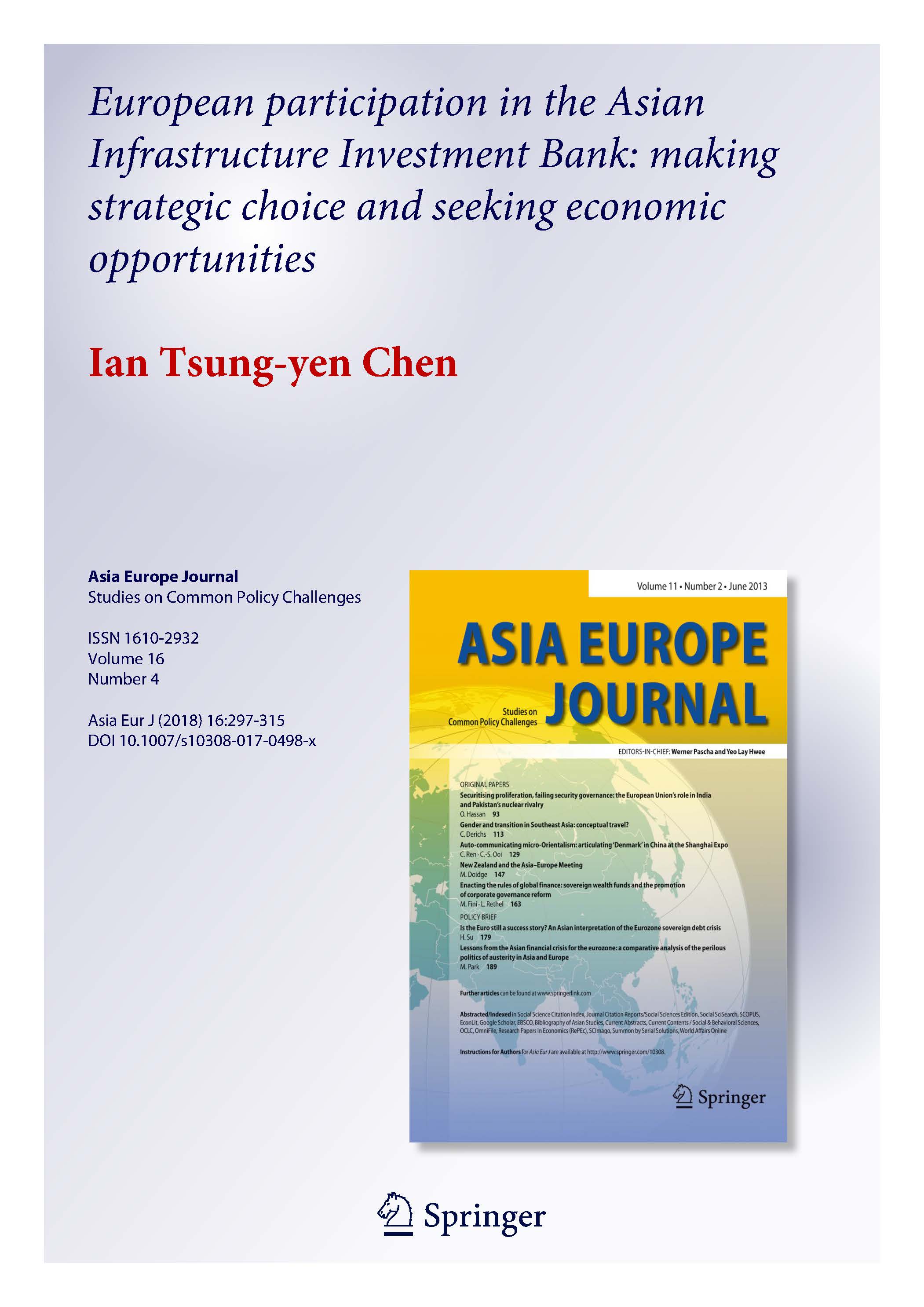Chen, Ian Tsung-yen. 2018. "European participation in the Asian Infrastructure Investment Bank: Making strategic choice and seeking economic opportunities." Asia Europe Journal 16(4): 297-315.