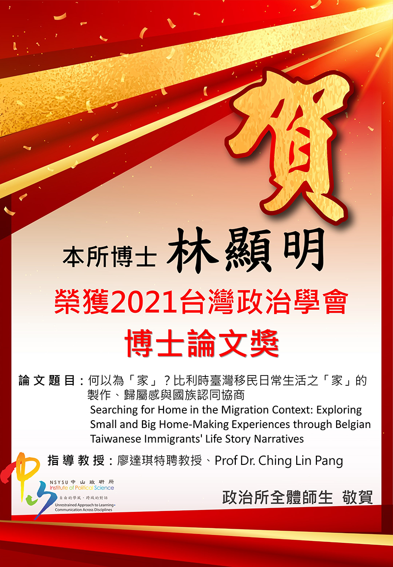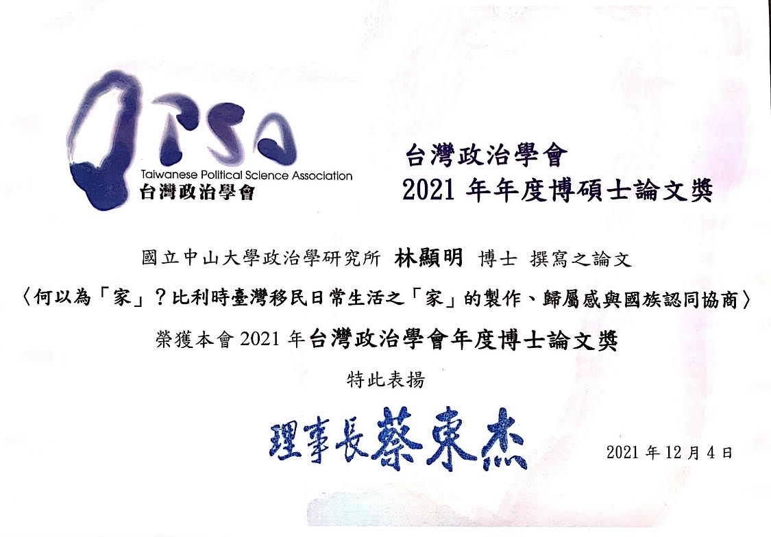 恭賀本所博士生林顯明榮獲2021台政會政治學博士論文獎