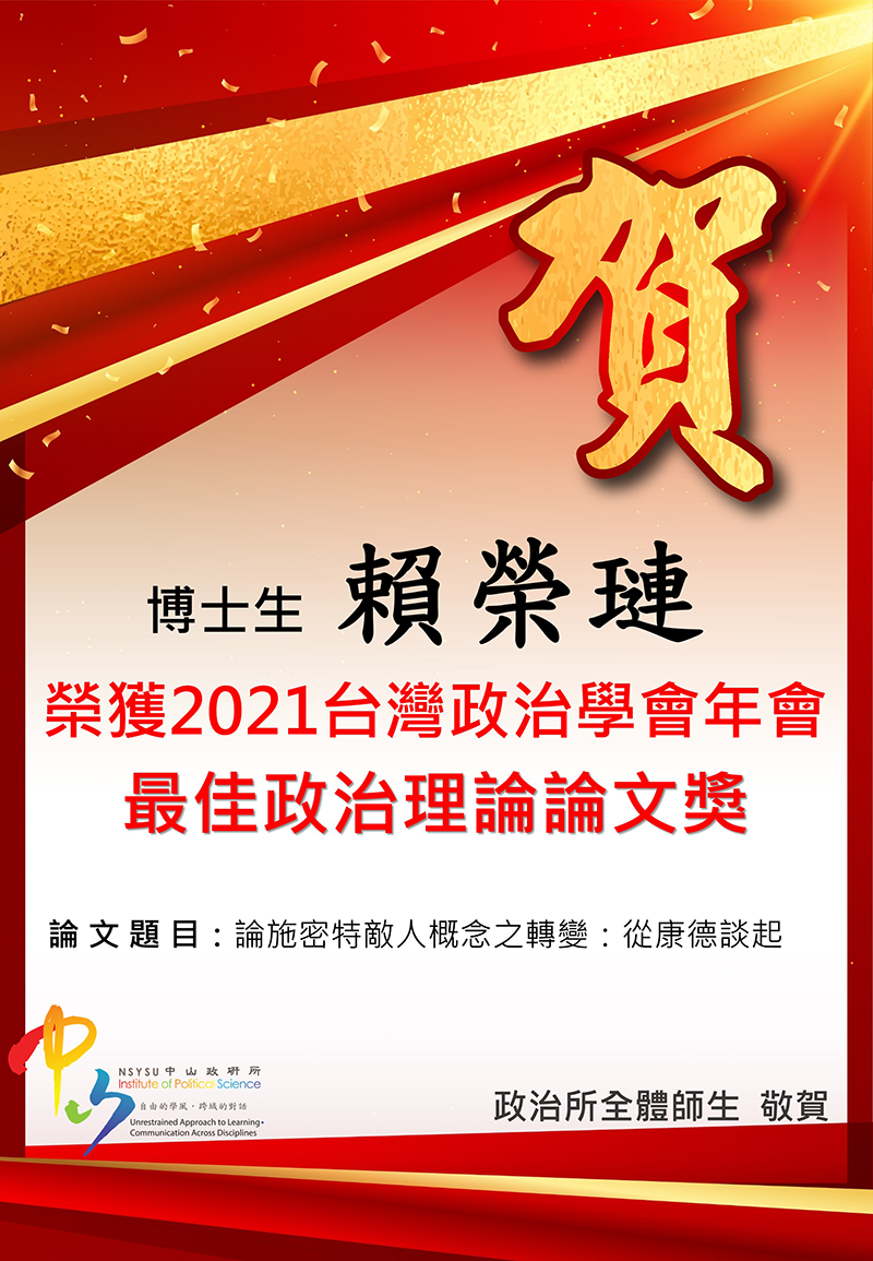 恭賀本所博士生賴榮璉榮獲2021台政會最佳政治理論論文