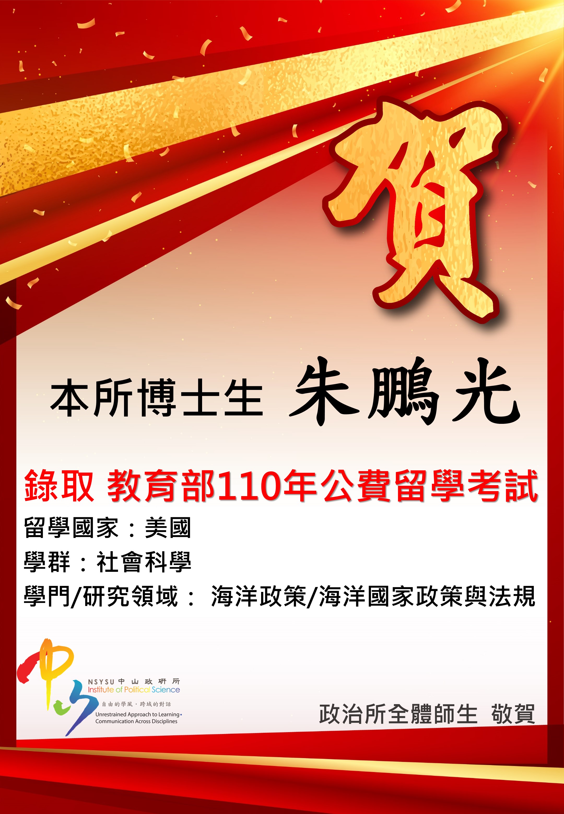恭賀本所博士生朱鵬光錄取教育部110學年公費留學考試