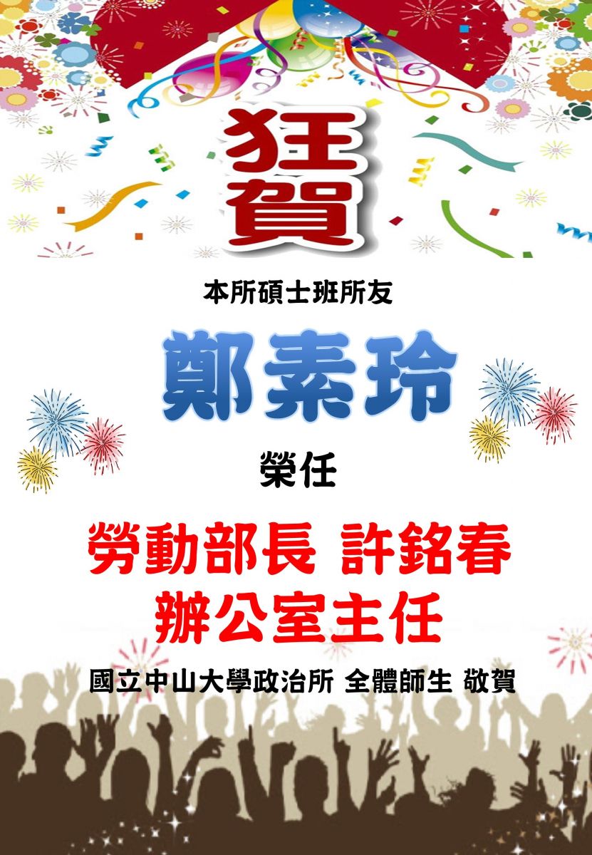 恭賀本所碩士班所友鄭素玲榮任勞動部長許銘春辦公室主任