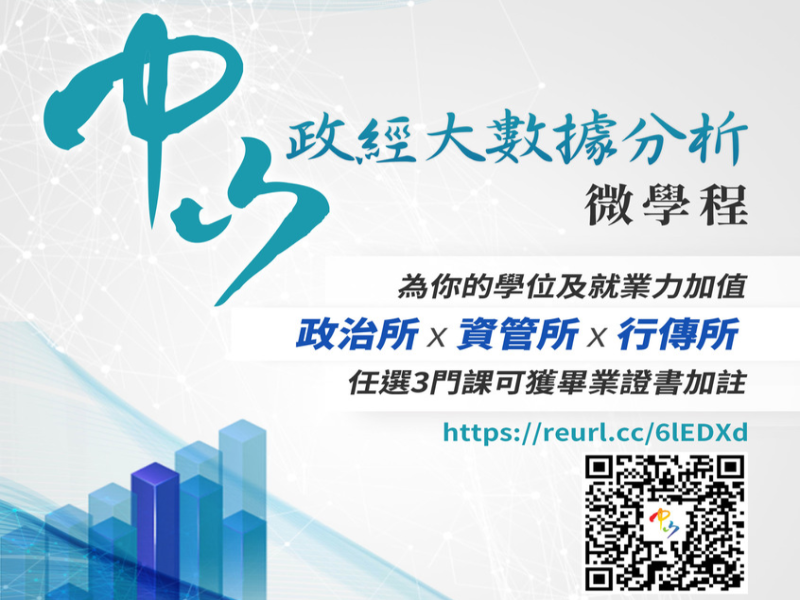 「政經大數據分析」微學程自109學年度第2學期開放申請,只要修滿學程規劃表上的9學分,就可在畢業證書上加註「政經大數據分析微學程」,提升未來的就業競爭力。欲知詳情,可連結中山政研所官網查看課程資訊。
