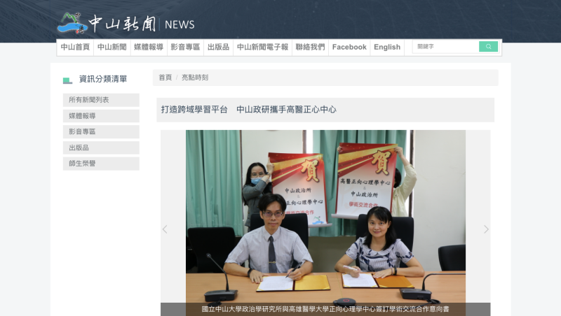 國立中山大學政治學研究所、高雄醫學大學正向心理學中心2學術研究機構首次跨域合作,簽訂學術交流合作意向書,未來雙方將結合政治與心理這兩大關於「人性」的研究領域,共同舉辦各項讀書會、座談會、工作坊、研討會等學術交流活動,並互邀研究人員演講及籌組研究群。