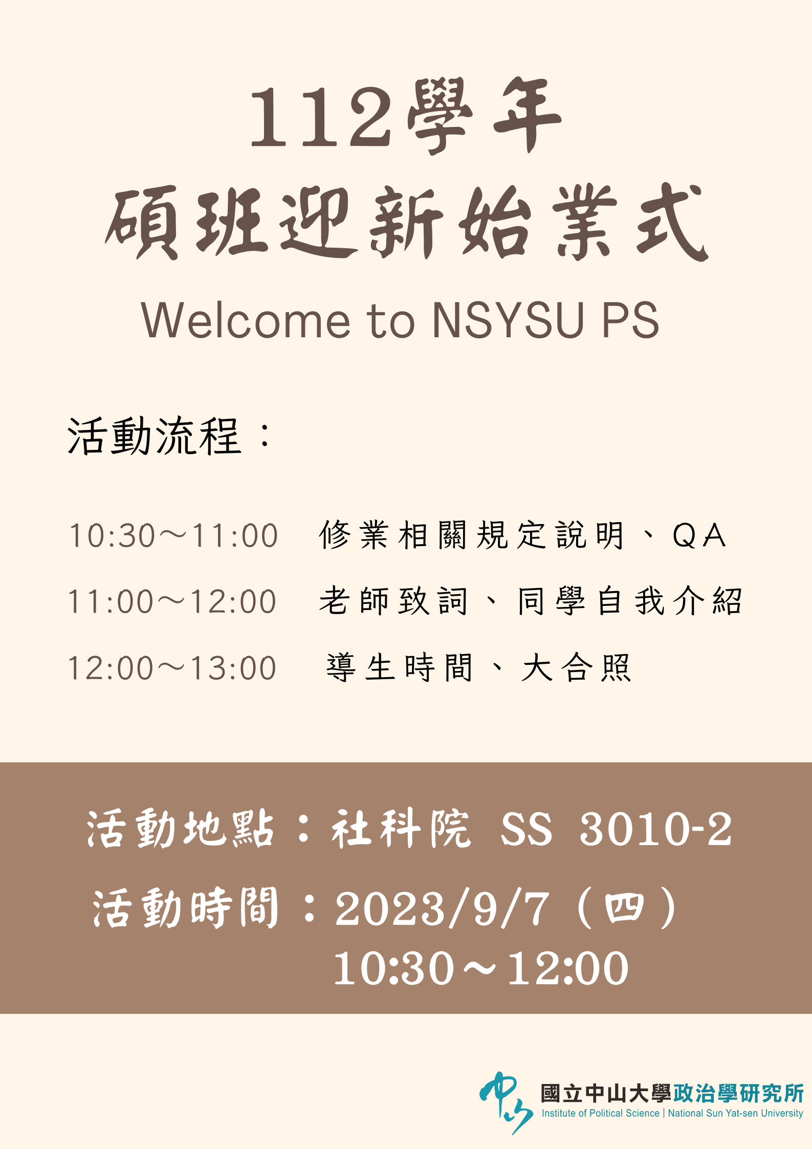 歡迎112級碩班新生來到中山政研所大家庭!為了歡迎大家的到來,本所所學會將於2023/09/07(四)舉行「迎新始業式」,邀請政研所師長、學長姐與新生們相見歡,歡迎大家一起來迎接成為研究生的第一個新學期,帶著問題與好奇心來與大家互動,認識這個大家庭。