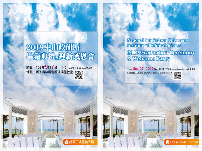 9月7日,學術聖堂開啟之日,也是中山政研畢業生正式向世界宣告振翅之時。歡迎在學同學踴躍報名,正裝出席觀禮。