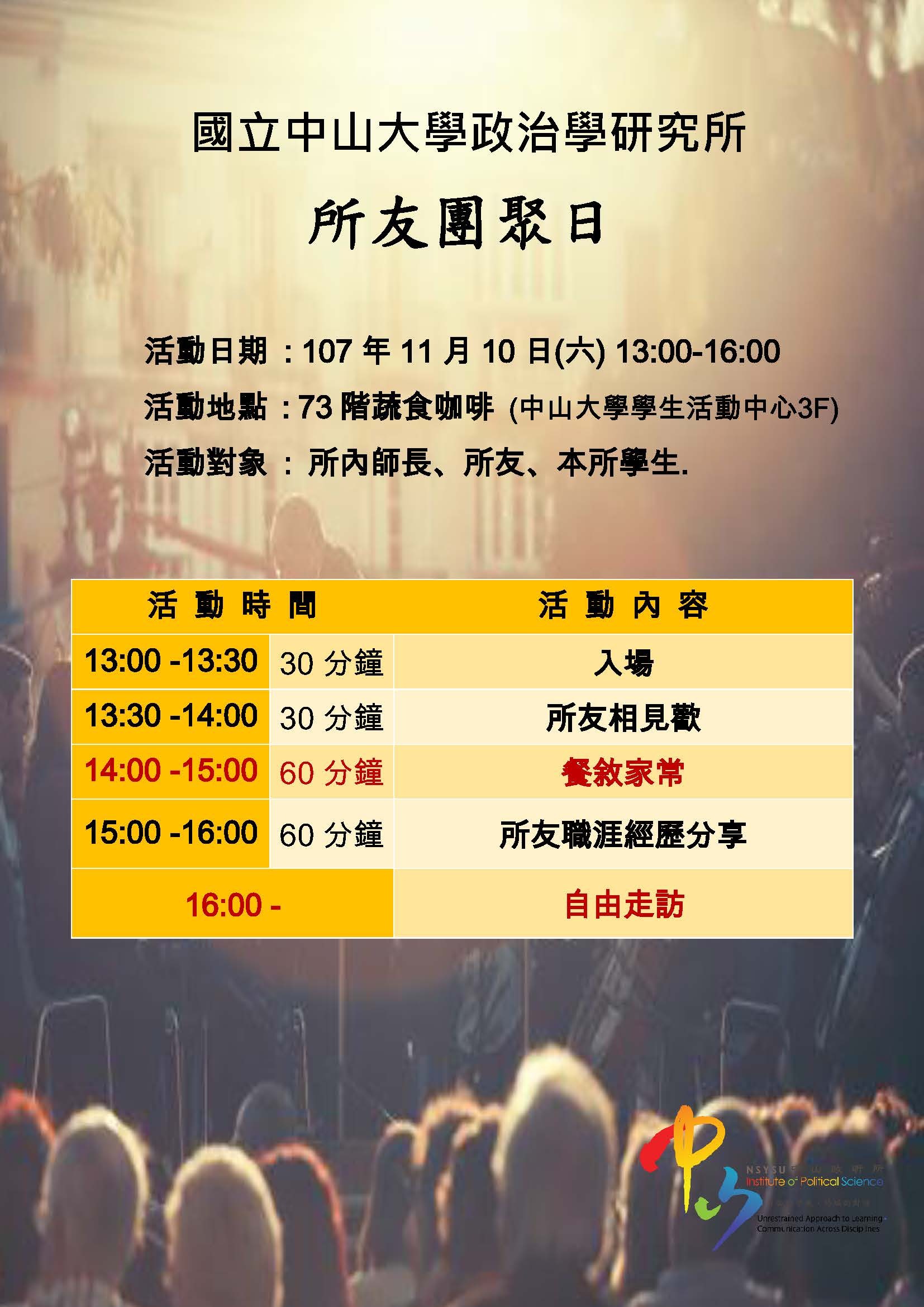 國立中山大學校慶38周年即將到來,時光飛逝,一年又過去,西子灣的夕陽依舊耀眼,您還記得在中山政研所的日子嗎?還記得與師長們在教室裡的學術對話嗎?還記得那段充滿著paper與論文的日子嗎?您有多久沒回來中山政治所了呢?