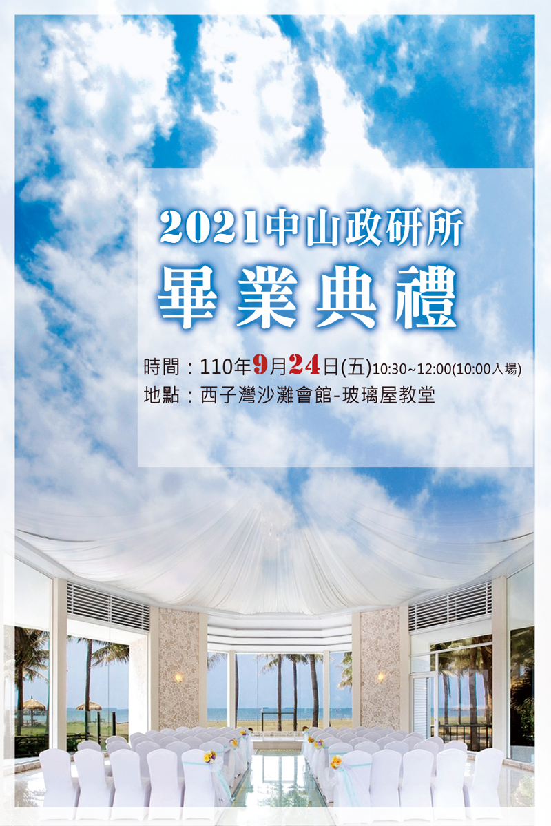 今年中山政研所的畢業典禮將在9月24日(五)上午10:30於西子灣沙灘會玻璃屋教堂館舉行,慶賀今年度完成(含即將完成)論文口試的碩士班、碩專班及博士班同學。
