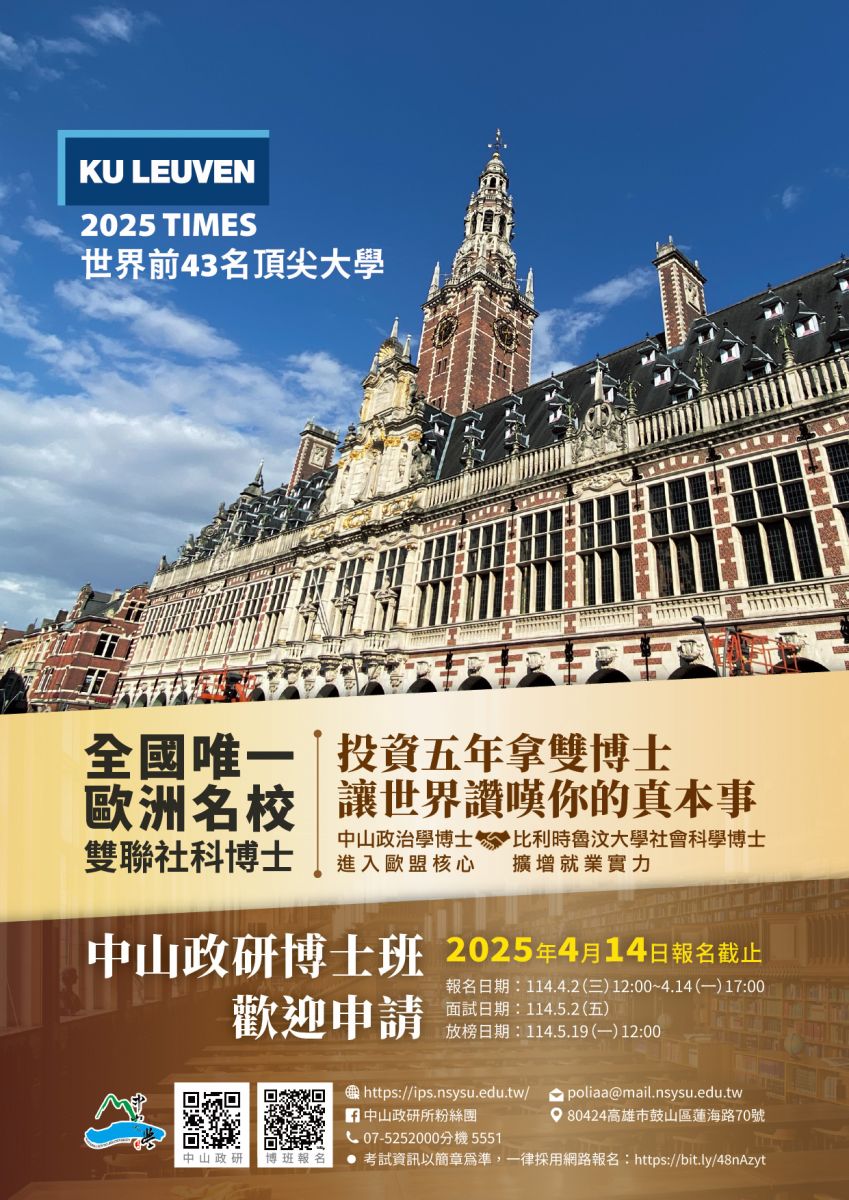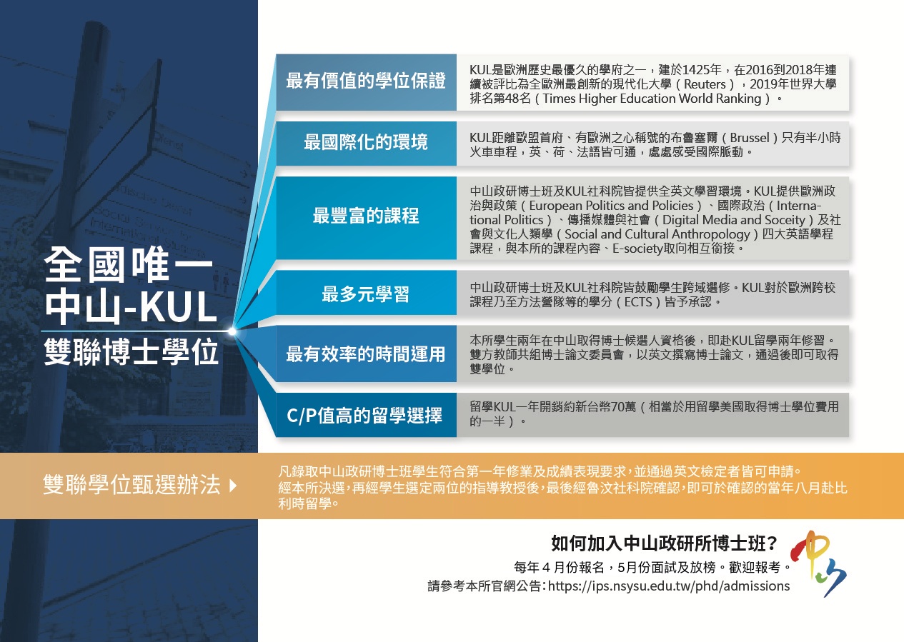 本雙聯學位是本所與比利時魯汶大學(KU Leuven)社會科學院之博士生能在雙邊指導教授的指導下,接受雙邊博士班之研究訓練、完成博士論文後,取得雙聯博士學位。