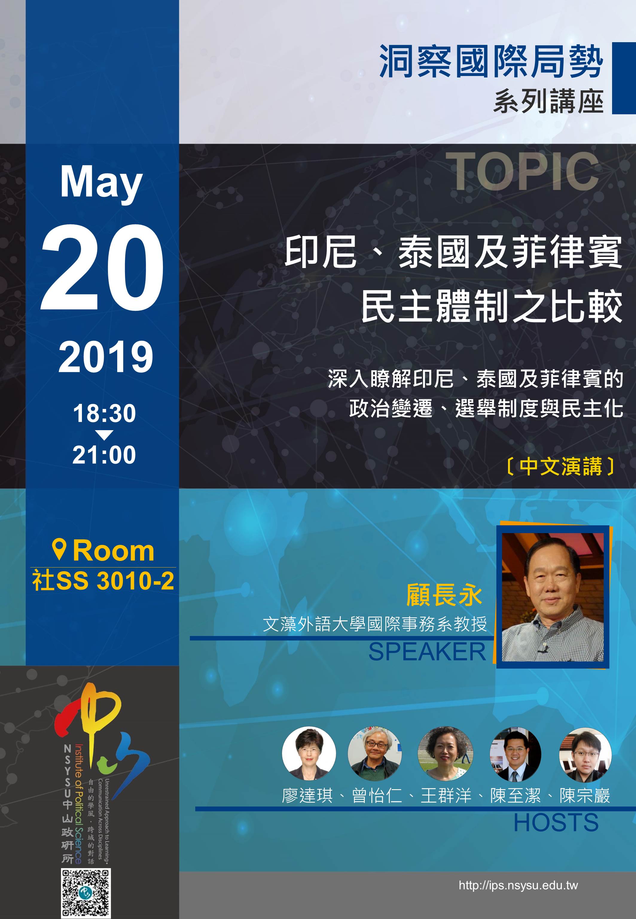 本所在「洞察國際局勢」系列講座,邀請到文藻外語大學國際事務系顧長永教授,以「印尼、泰國、菲律賓民主體制之比較」為題,剖析上述東南亞國家之政治發展歷程,有何異同之處。