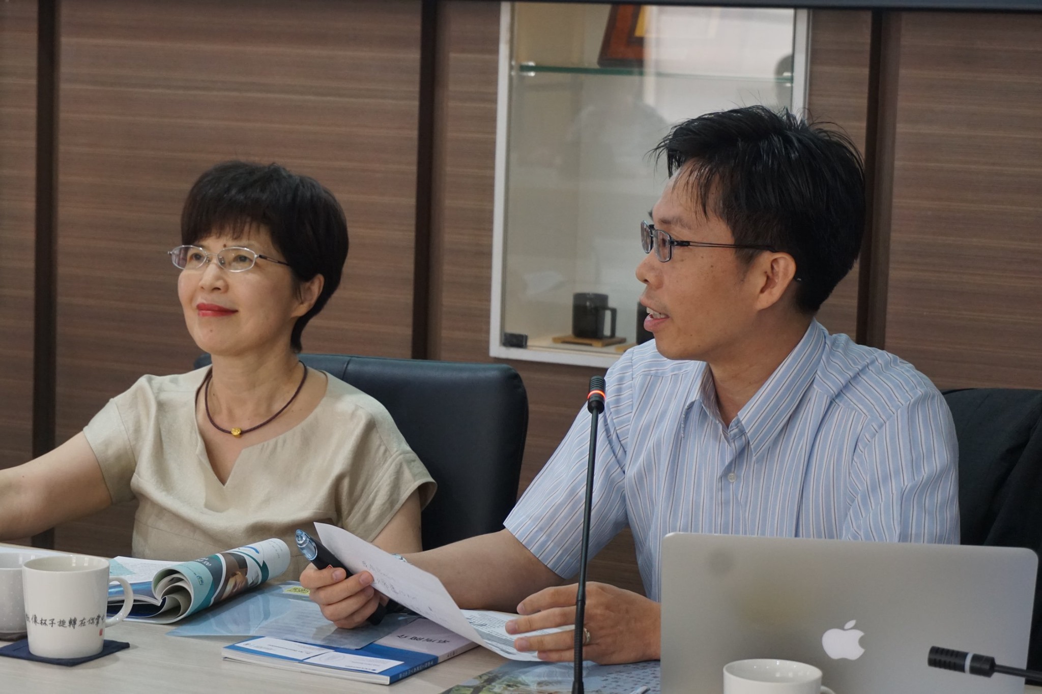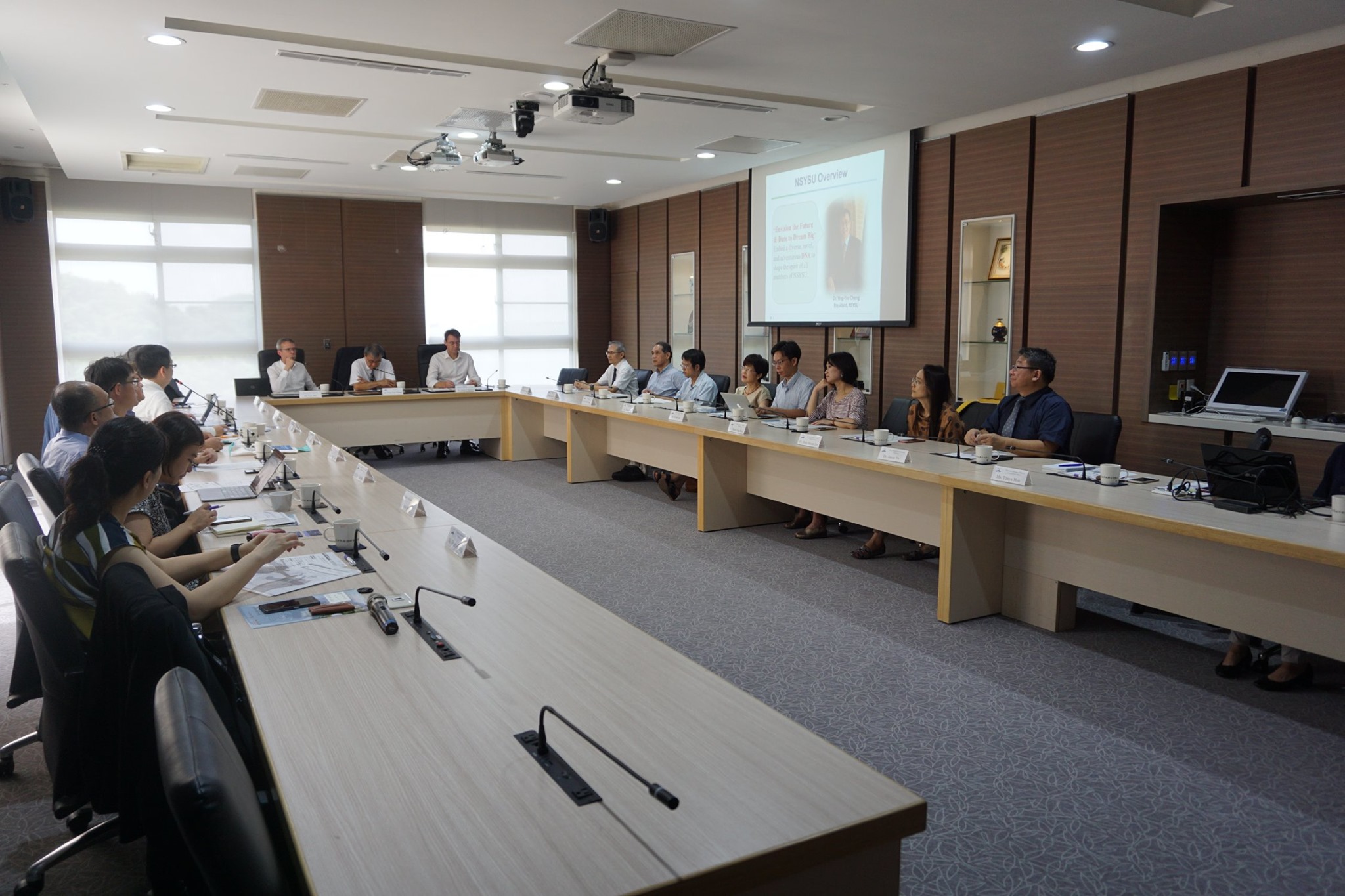 兩位明星校長接下來聆聽管理學院黃三益院長,以及社科院由所長劉正山老師代表進行的簡報。之後廖達琪榮譽講座教授、政經系辛翠玲教授及李明軒教授加入分享,亦讓兩位明星校長印象深刻,表示將繼續深化KUL及中山政研經營的E-society學術平台、雙聯博士學位。本校鄭英耀校長期勉同仁繼續深化國際化的努力,未來將推動三校之間的交換生計畫,以夏季學校(summer school)計畫。