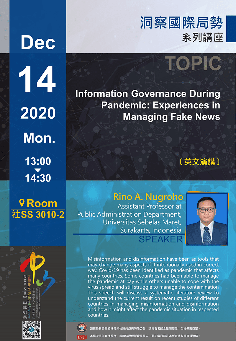 主講人:Rino A. Nugroho (Assistant Professor at Public Administration Department, Universitas Sebelas Maret, Surakarta, Indonesia)