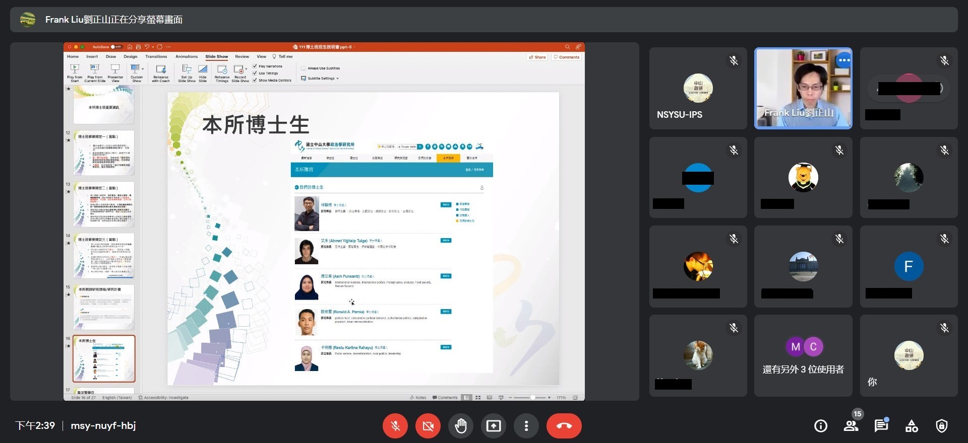 本所於3月11日舉辦了博士班線上招生說明會,為本所首次針對博士班舉辦說明會,會中所長親自介紹了本所的各項特色、就讀本所的優勢、菁英獎學金 (每月3-4萬)等獎助學金、職涯地圖等,全職/在職/跨國雙學位身份學長姐分享了魯汶雙學位及就讀博士班的求學經驗,參與者亦踴躍提問,希望透過這場說明會能對未來想就讀博士班的規劃有更深一層的認識。