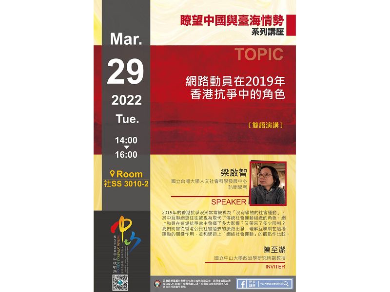 本所舉辦「瞭望中國與臺海情勢」系列講座,資訊如下: