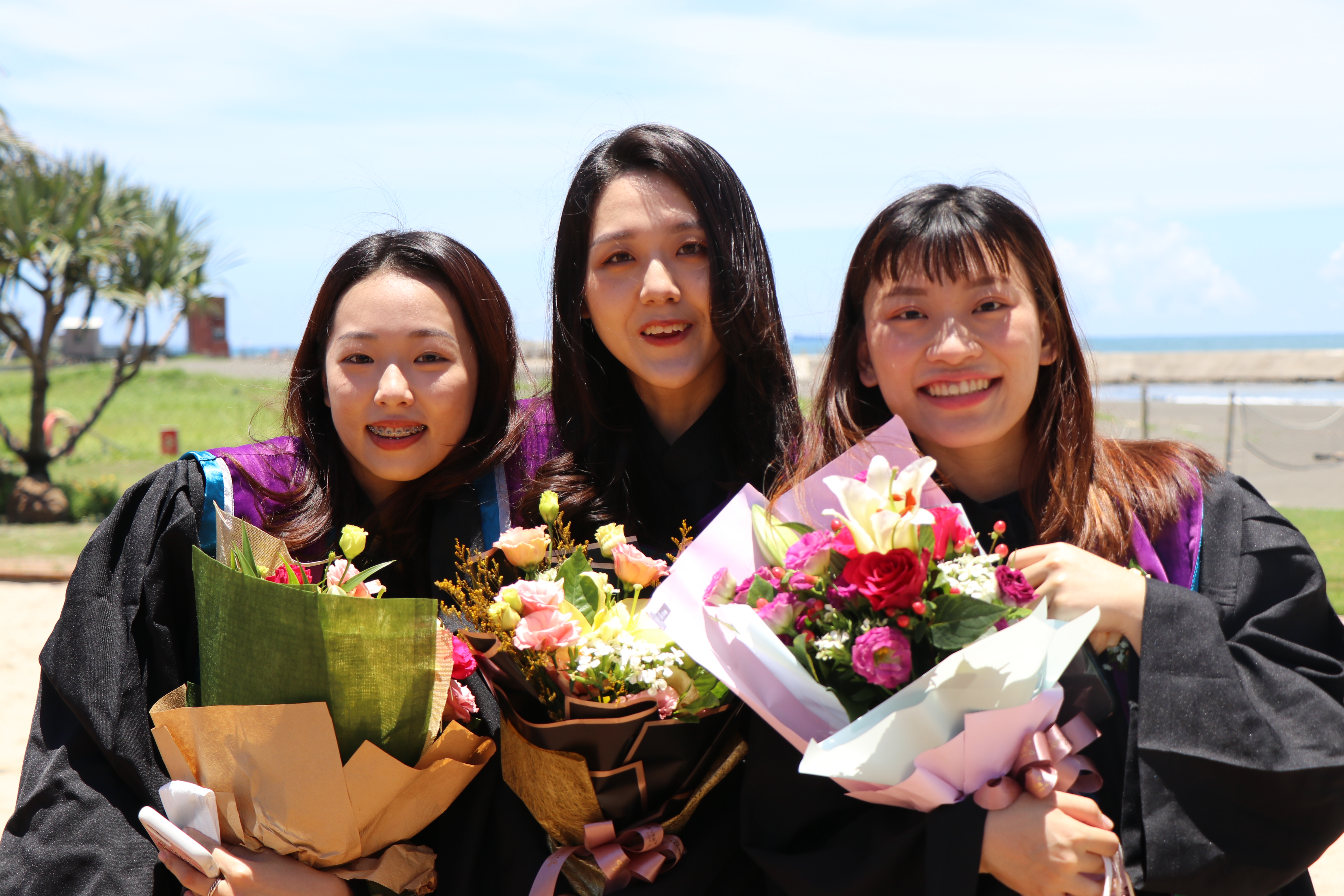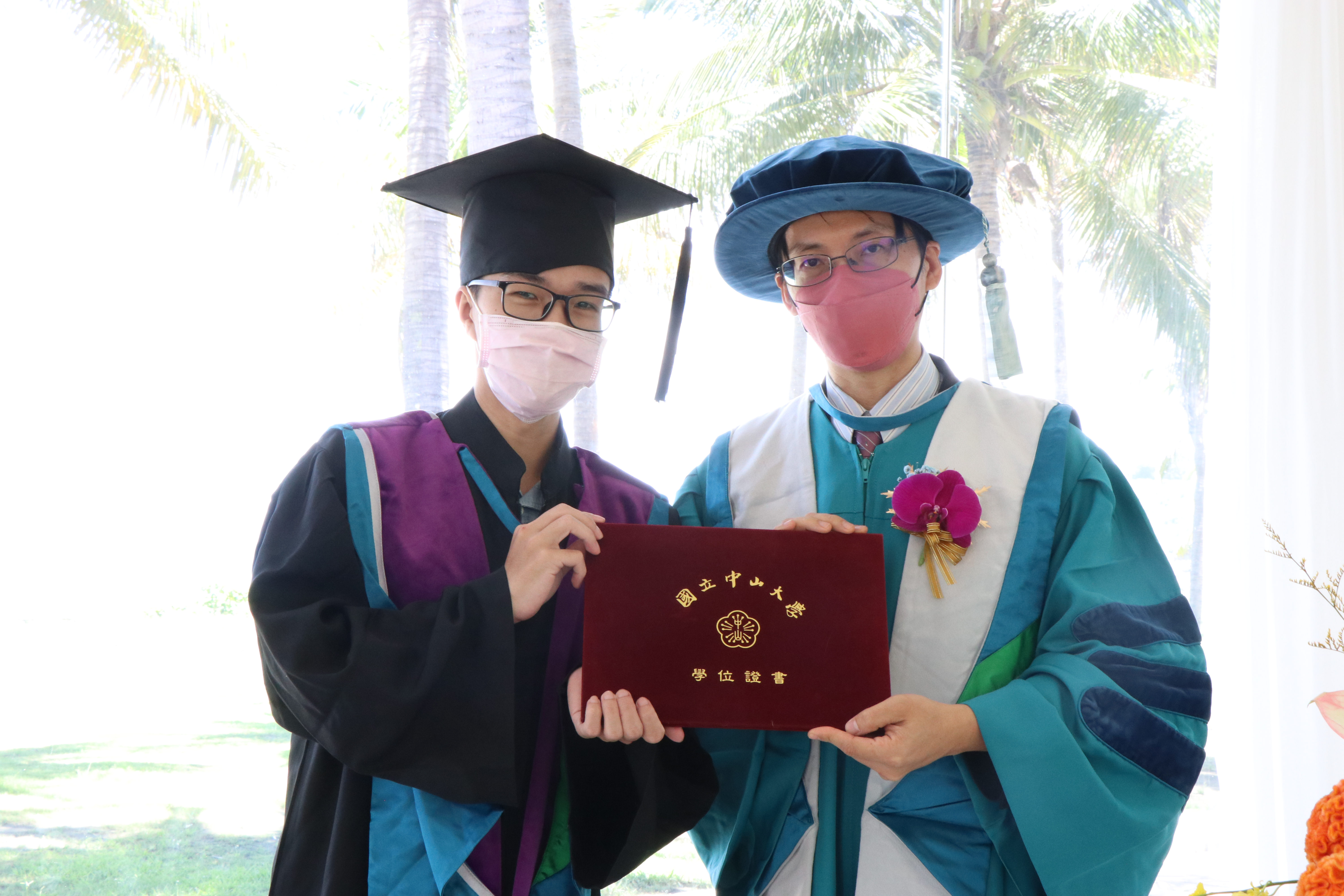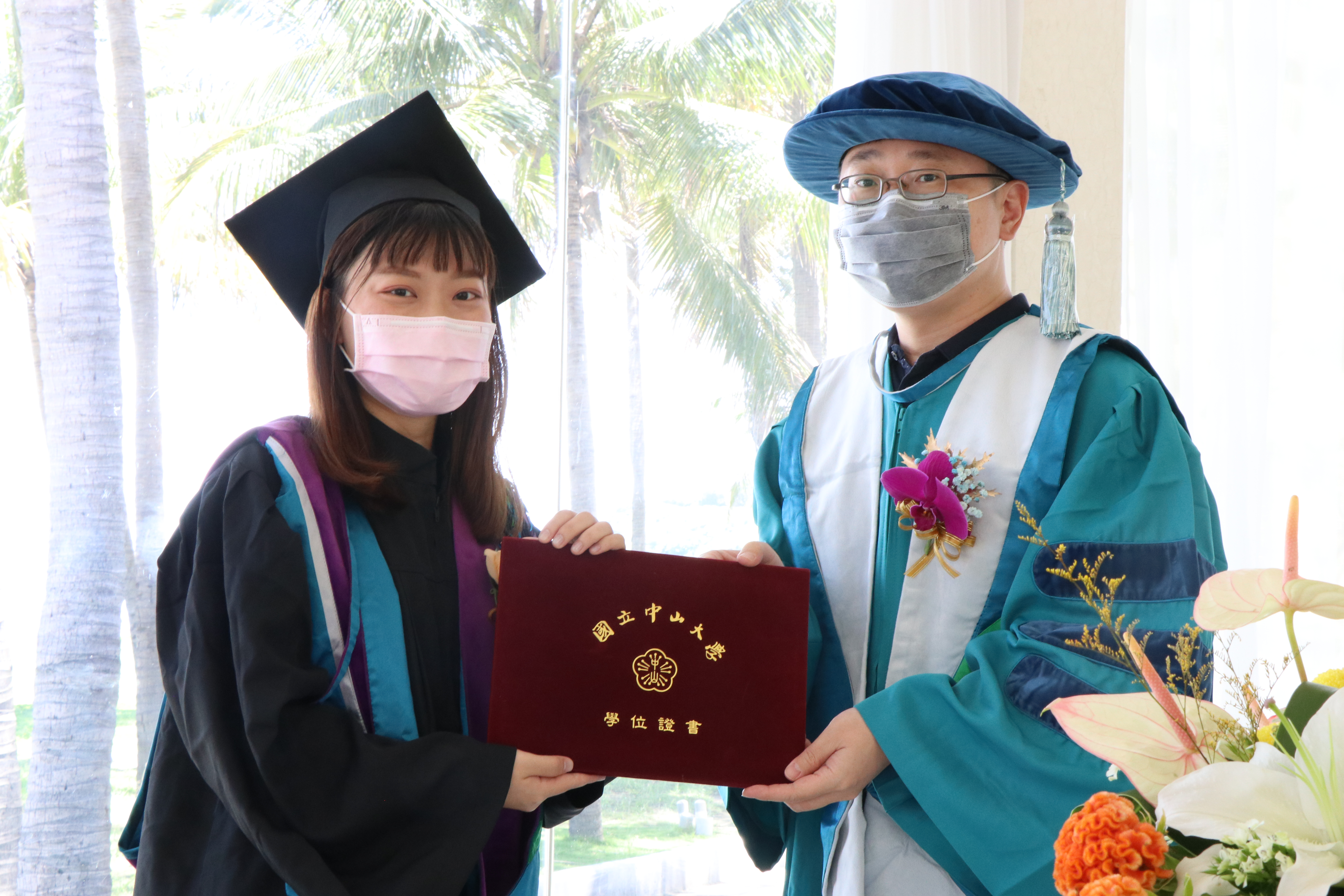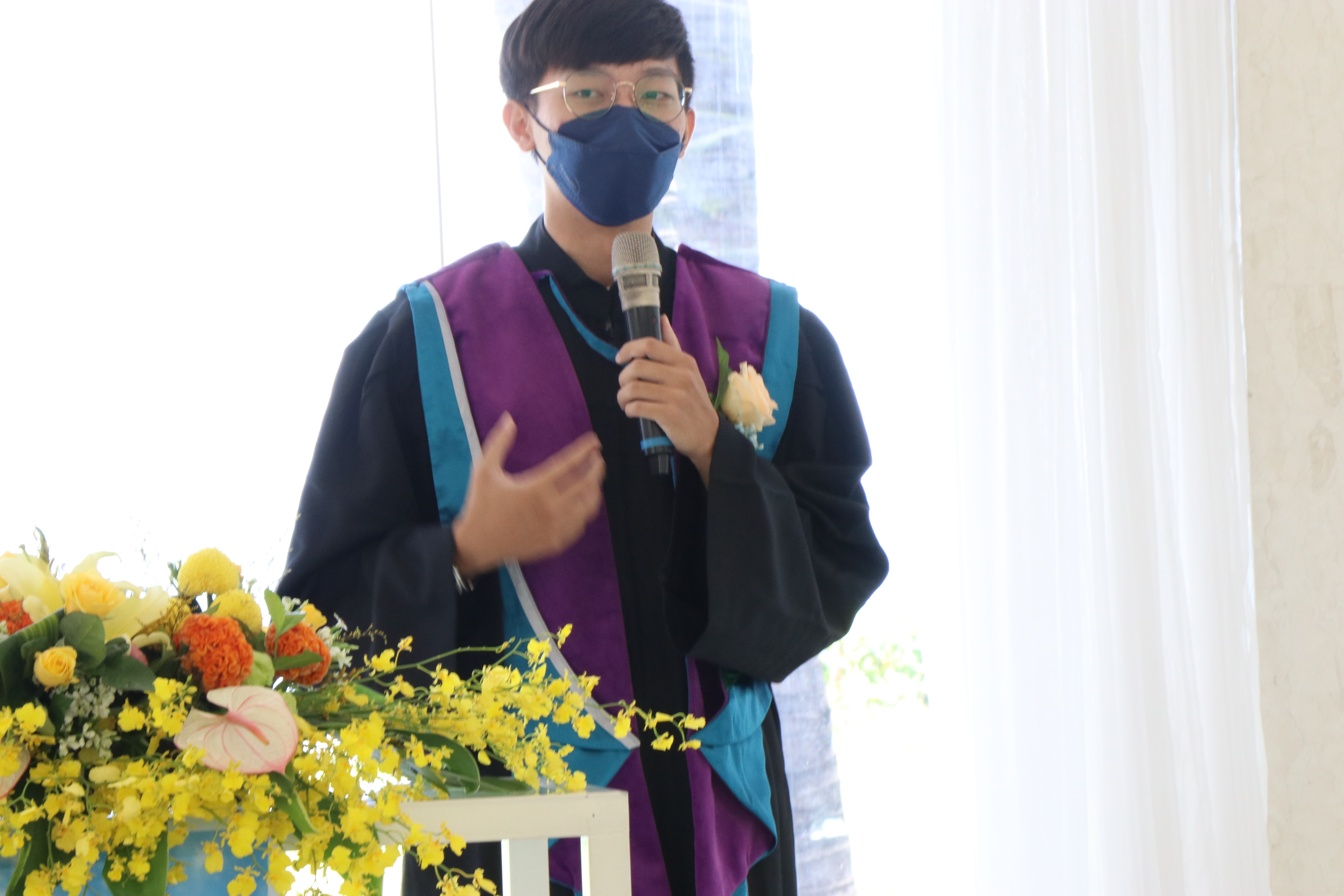 典禮最後,由在校生致詞由碩一賴以展代表獻上誠摯祝福,縱然紅磚外的世界風雨如晦,但中山大學始終是一個避風港,未來各位進入社會以後,或許才是真正挑戰的開始,祝福各位畢業生有夢最美,希望相隨,我們期待再相會。