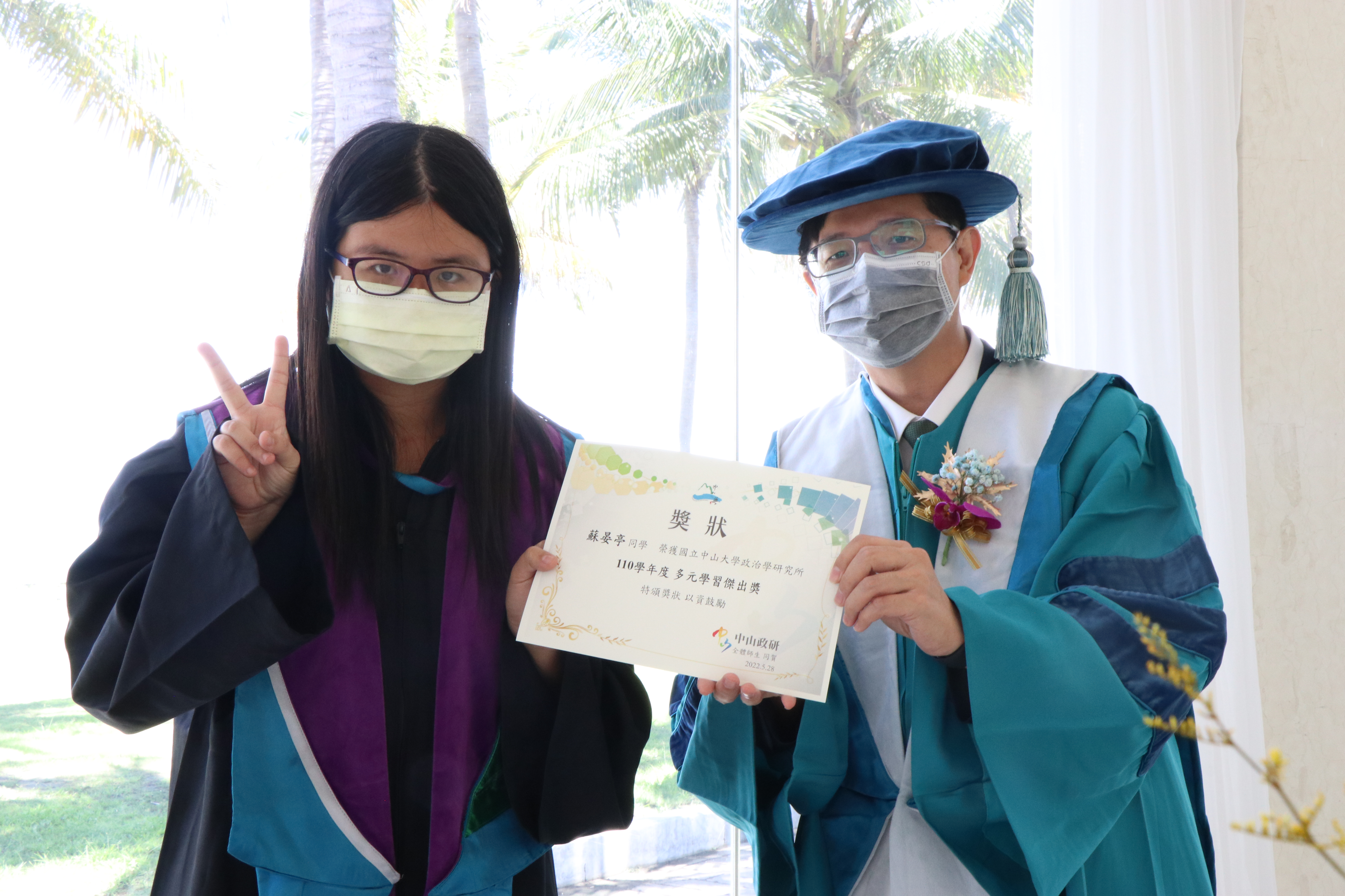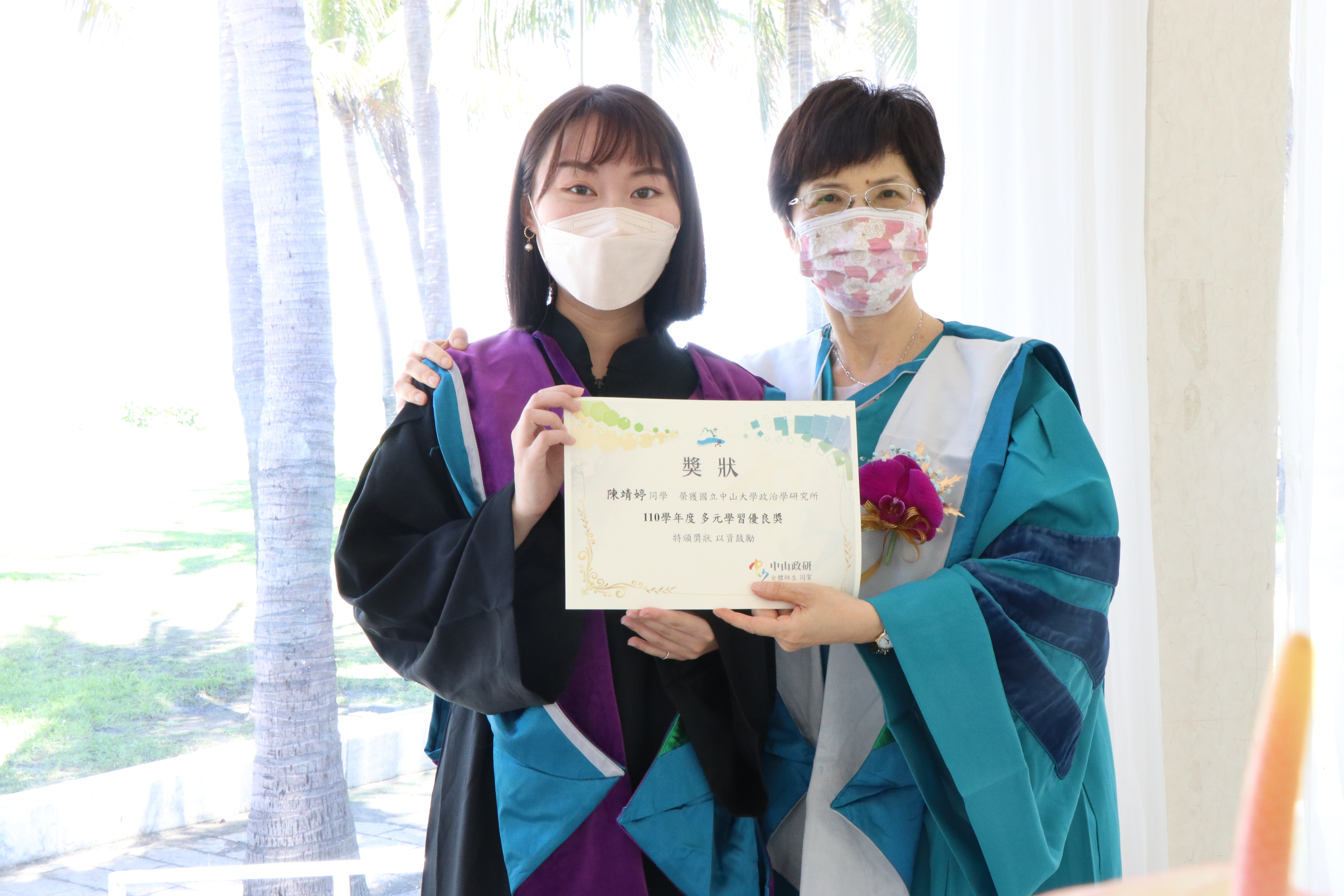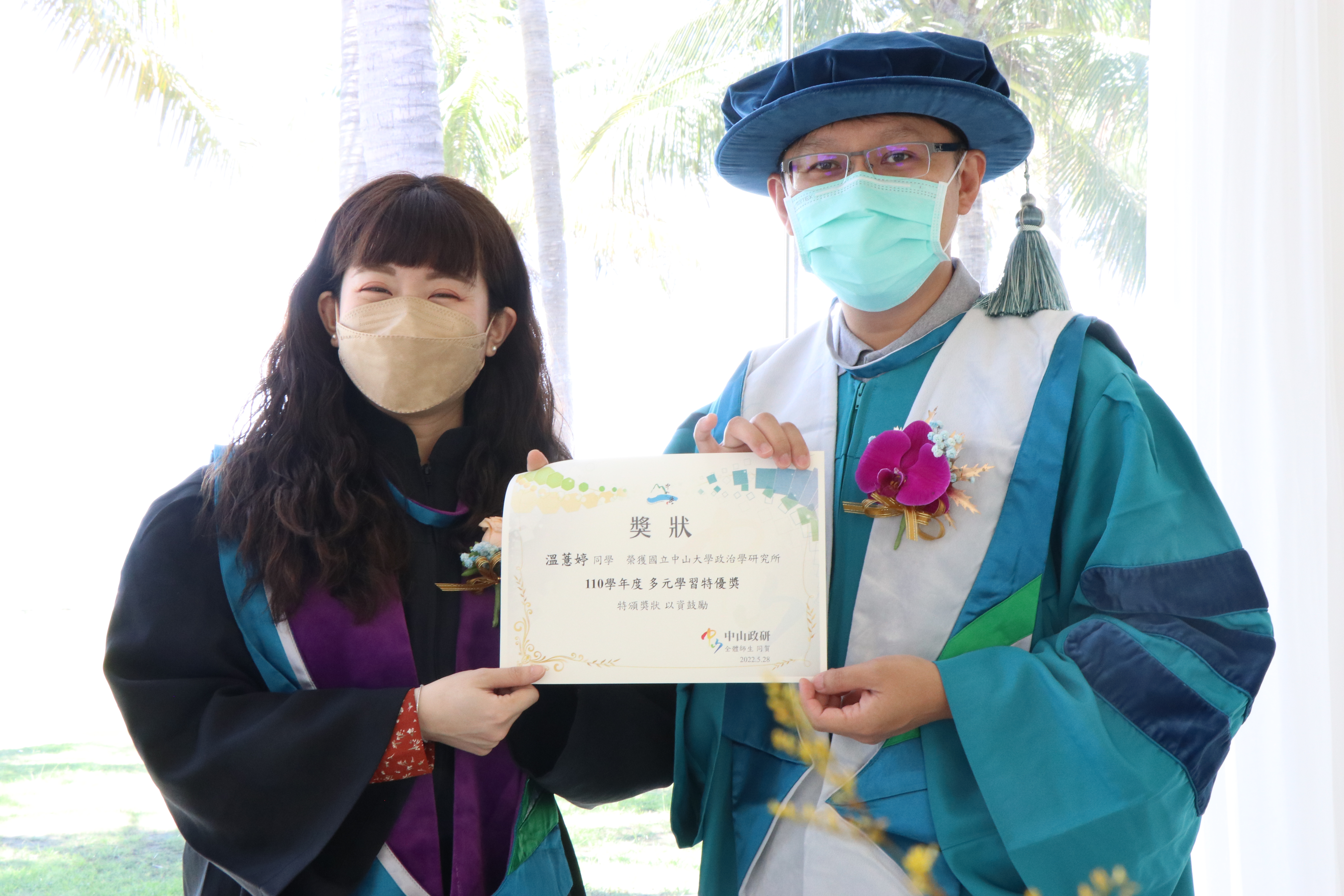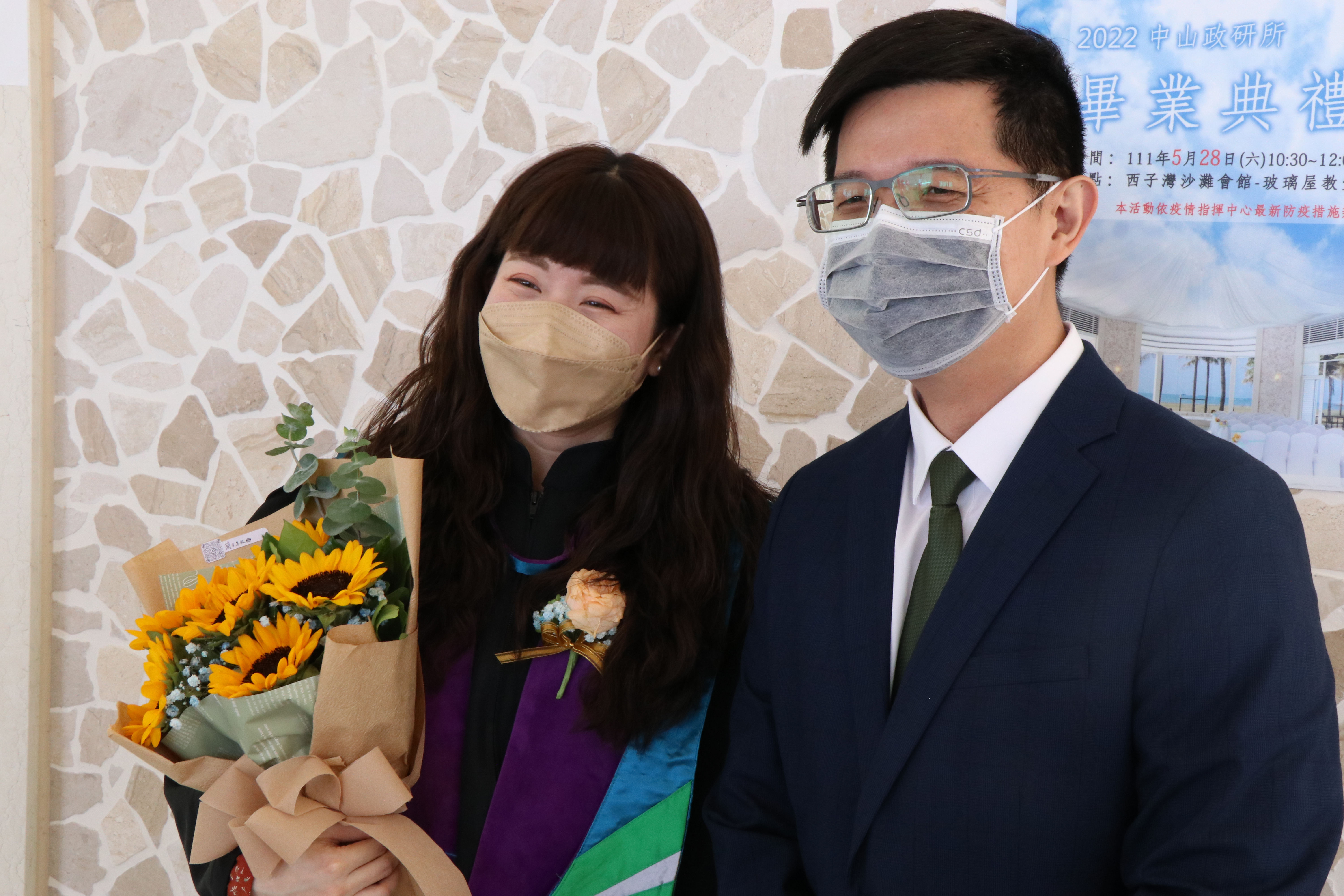 畢業生致詞由陳典君與碩專班歐雅欣代表,兩位回憶起這兩年在政研所的日子,對老師們平日的諄諄教誨表達感謝,也由衷感謝家人的默默支持,才能讓我們能無憂無慮在中山求學。