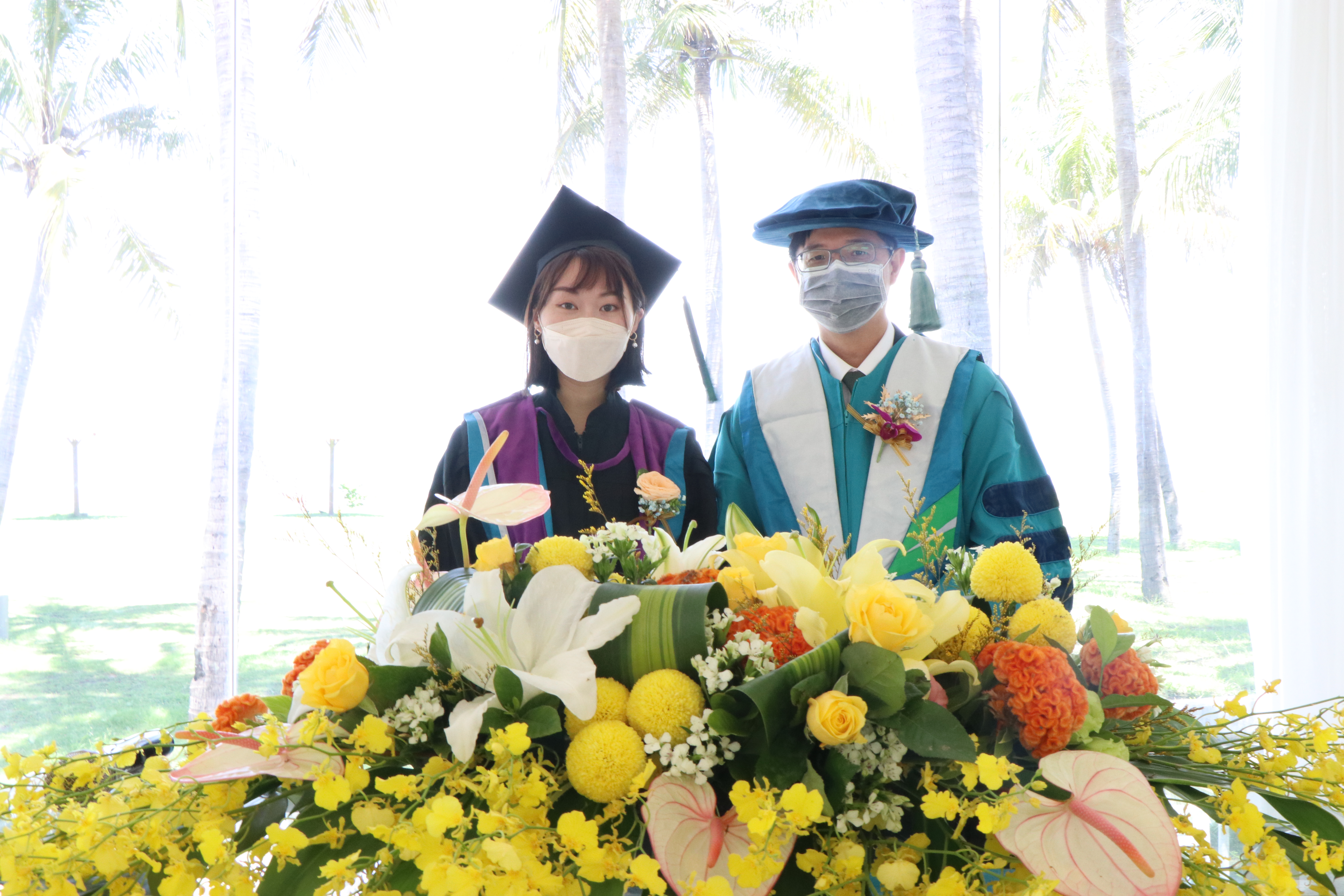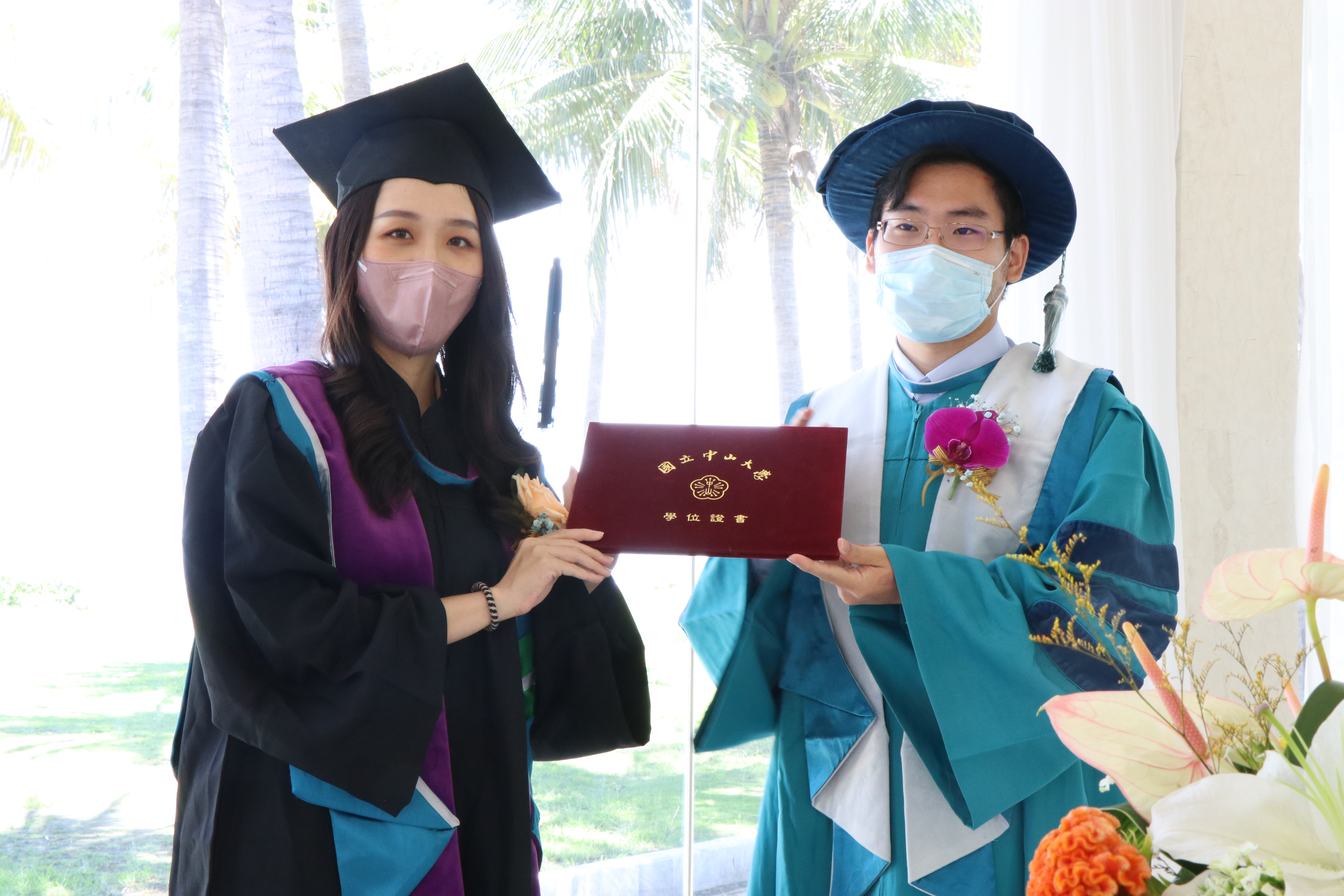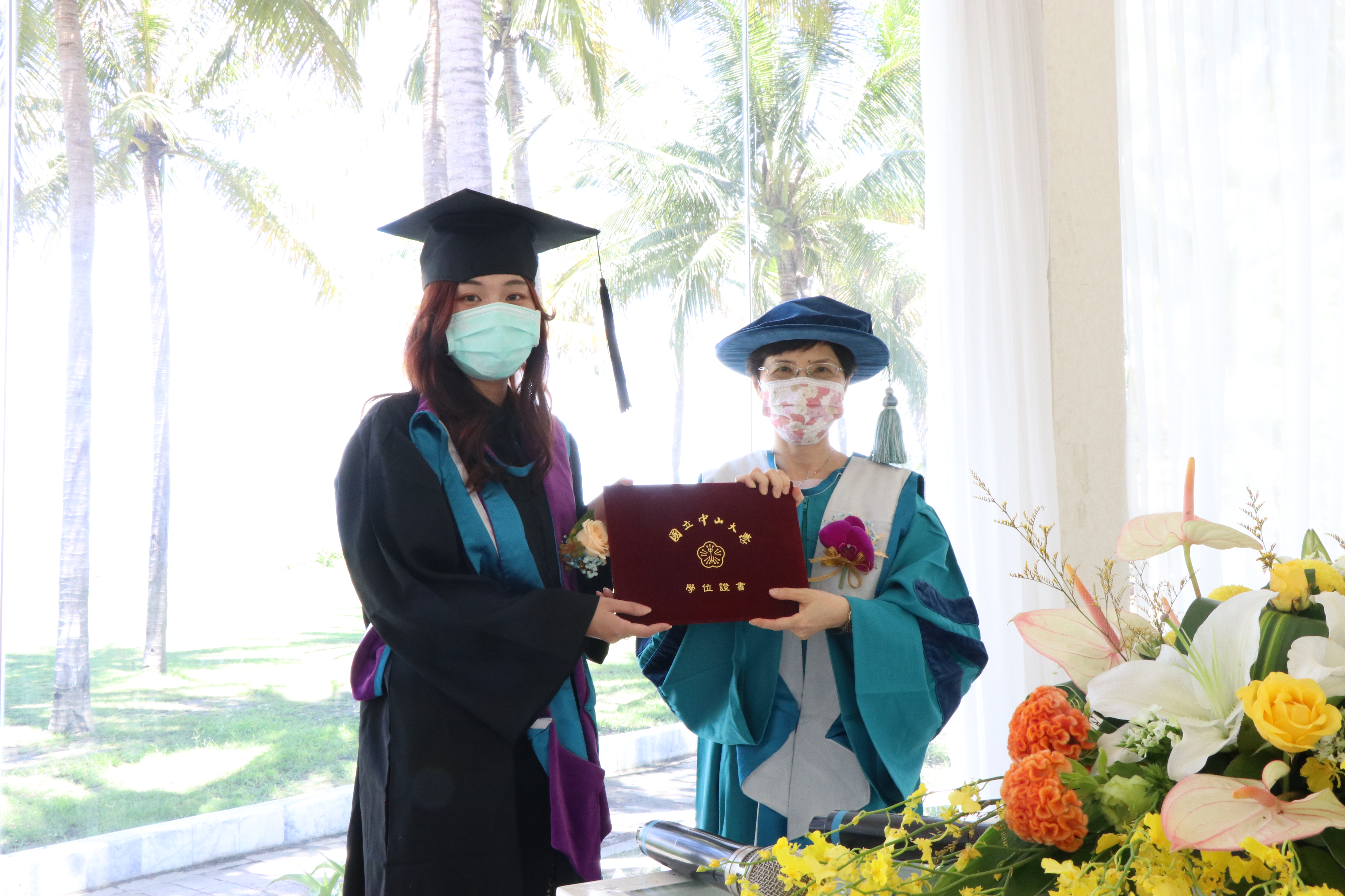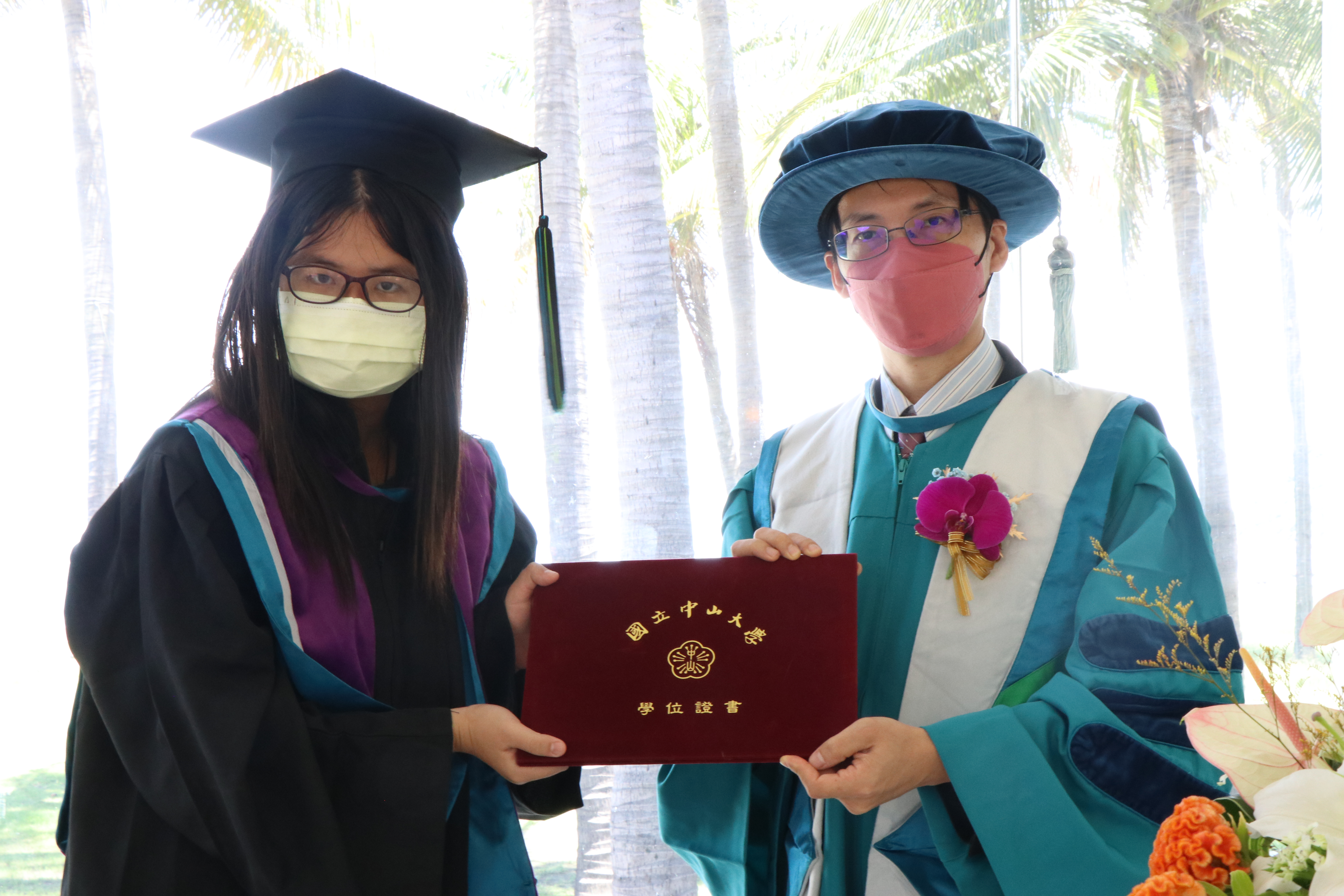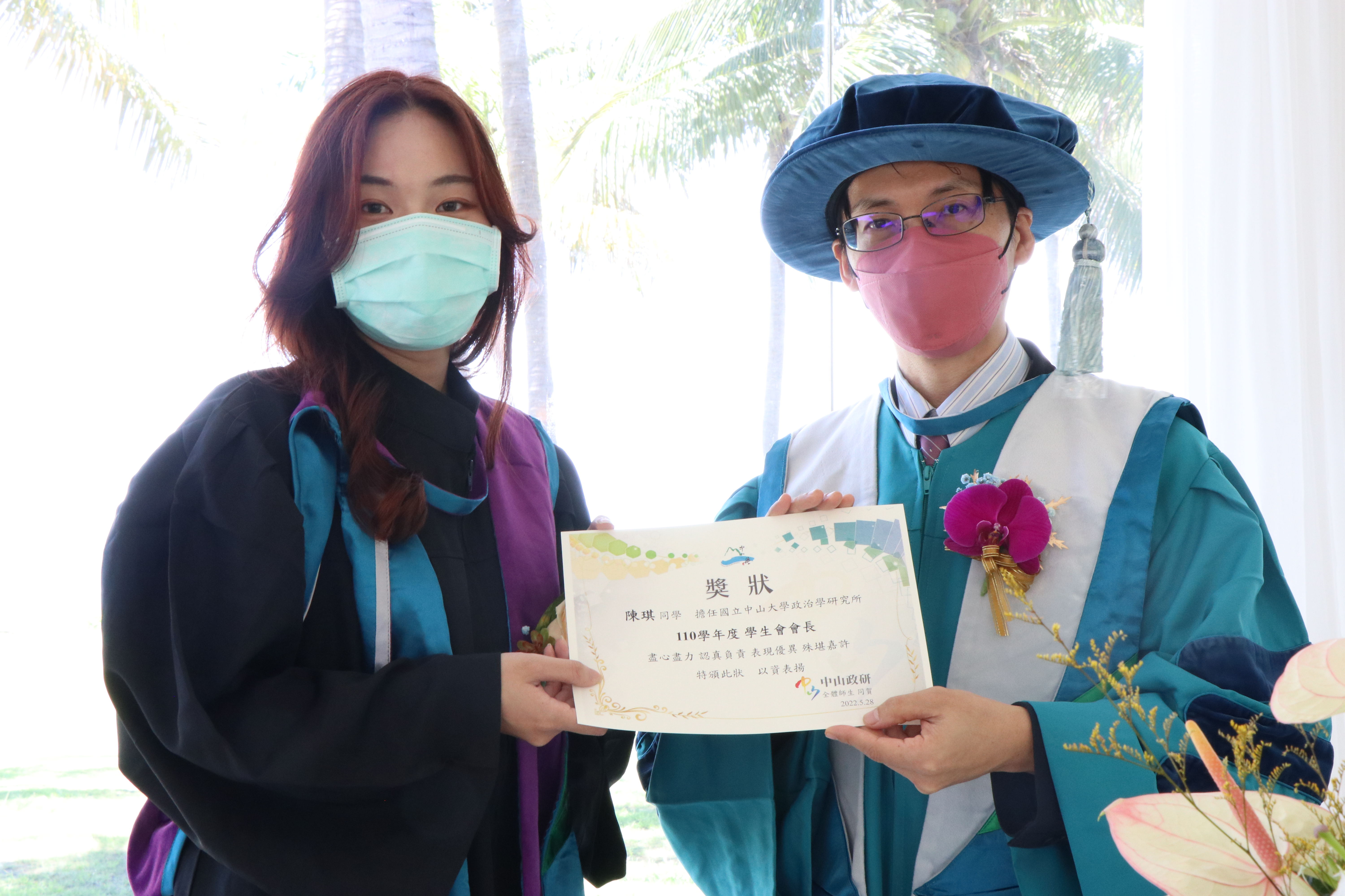 畢業生致詞由陳典君與碩專班歐雅欣代表,兩位回憶起這兩年在政研所的日子,對老師們平日的諄諄教誨表達感謝,也由衷感謝家人的默默支持,才能讓我們能無憂無慮在中山求學。