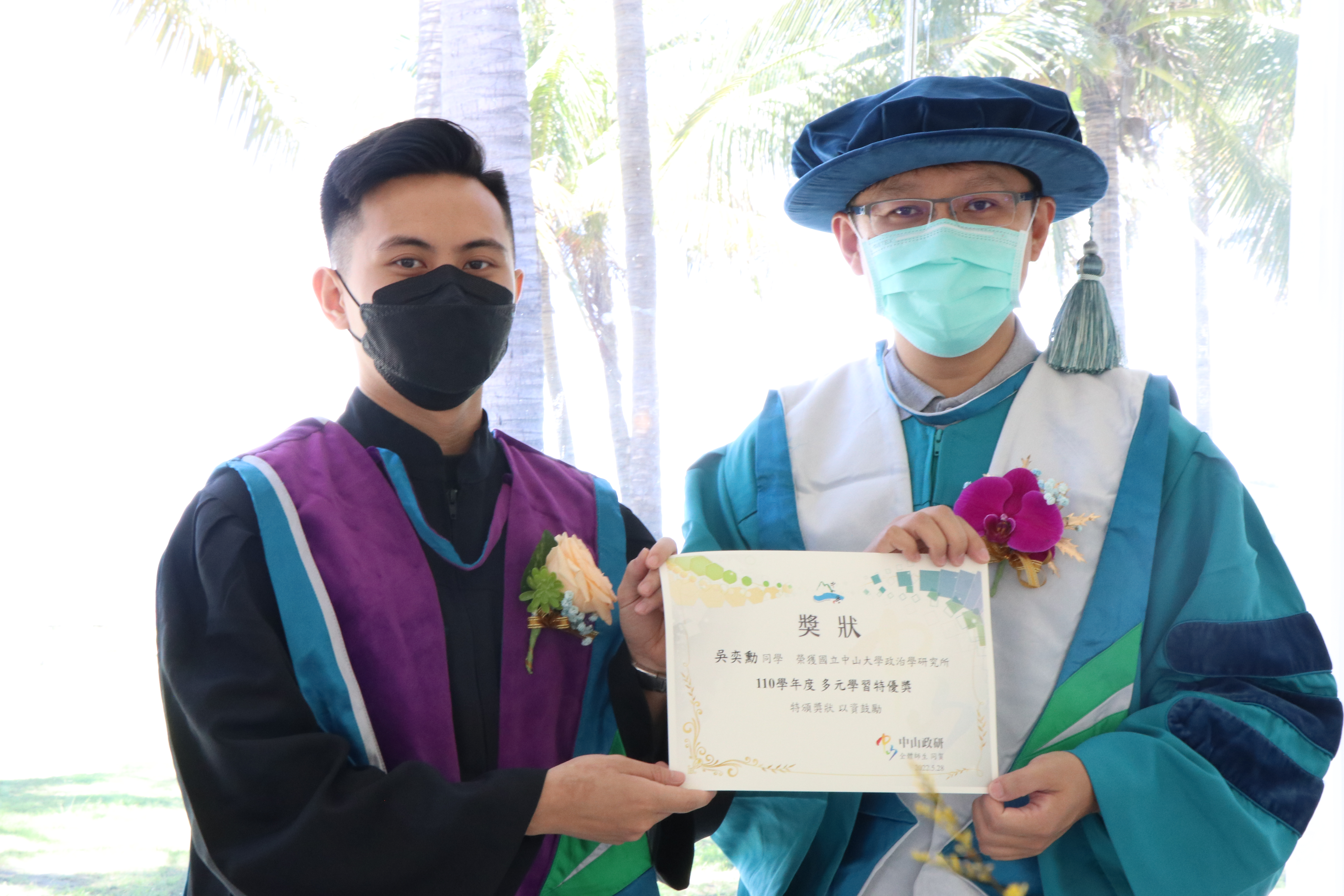 典禮上劉正山所長也勉勵畢業生們,取得政治學碩士學位的這一刻,是很神聖的,各位畢業生成就了自己,以及自己的家人,過去這兩年的時間裡,各位做了一般研究生所不會做的事,那就是你的心胸是看著世界和人群,你的心胸比任何拿碩士學位的人更為廣大,你看的是人群的幸福、世界的未來,這是最讓人感到光榮的地方。
