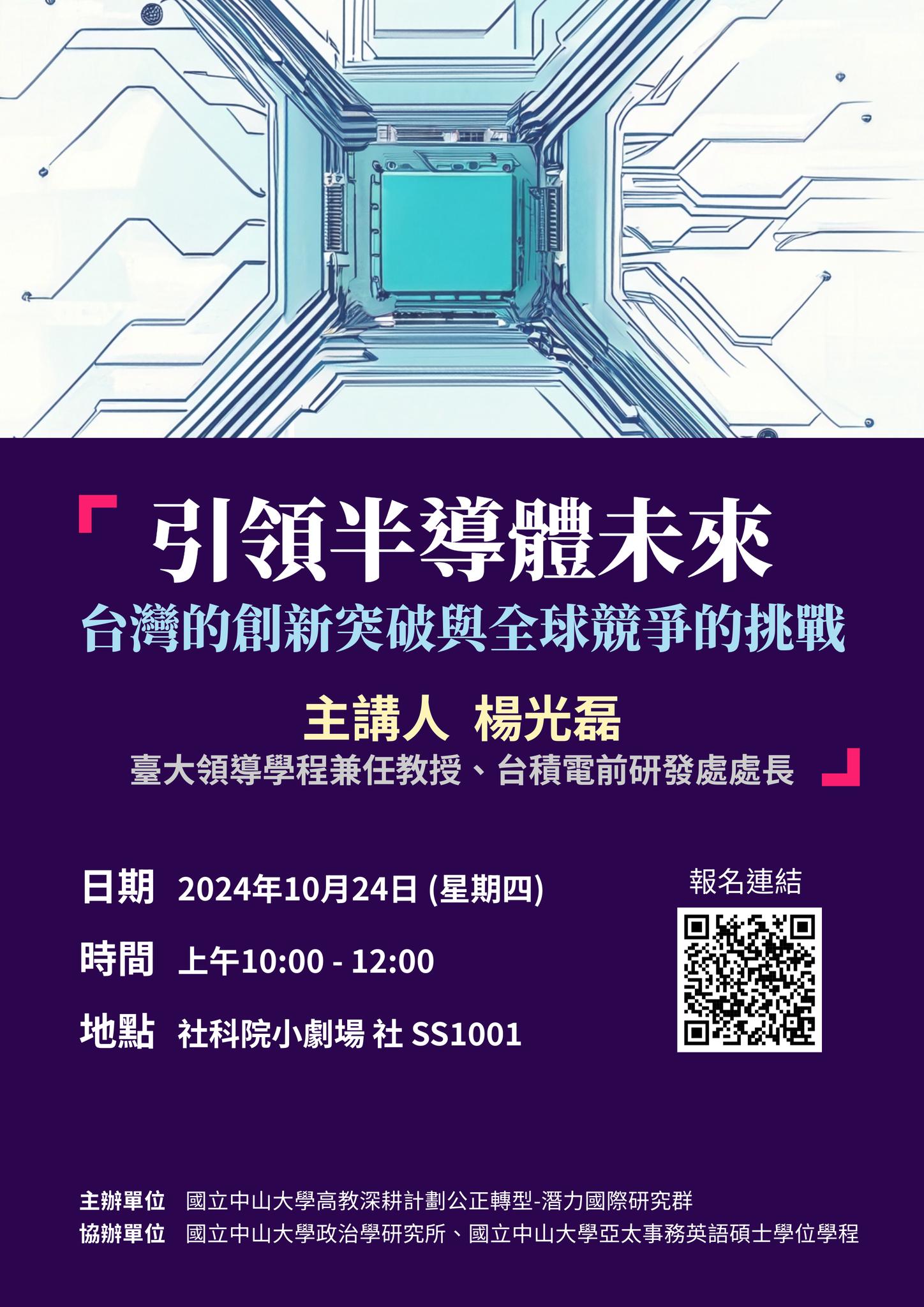 感謝亞太事務英語學程劉奇峯教授牽線合作,還有社科院與政經系師生的大力支持,讓我們政研所促成了「台積電研發六騎士」之一的楊光磊教授來演講。他不僅是台大教授,還曾任台積電研發長,擁有深厚的技術背景,簡直是台灣半導體崛起的活歷史;他同時也具備人文與社會科學的素養與領導視野,讓這場半導體講座帶點「斜槓」感!