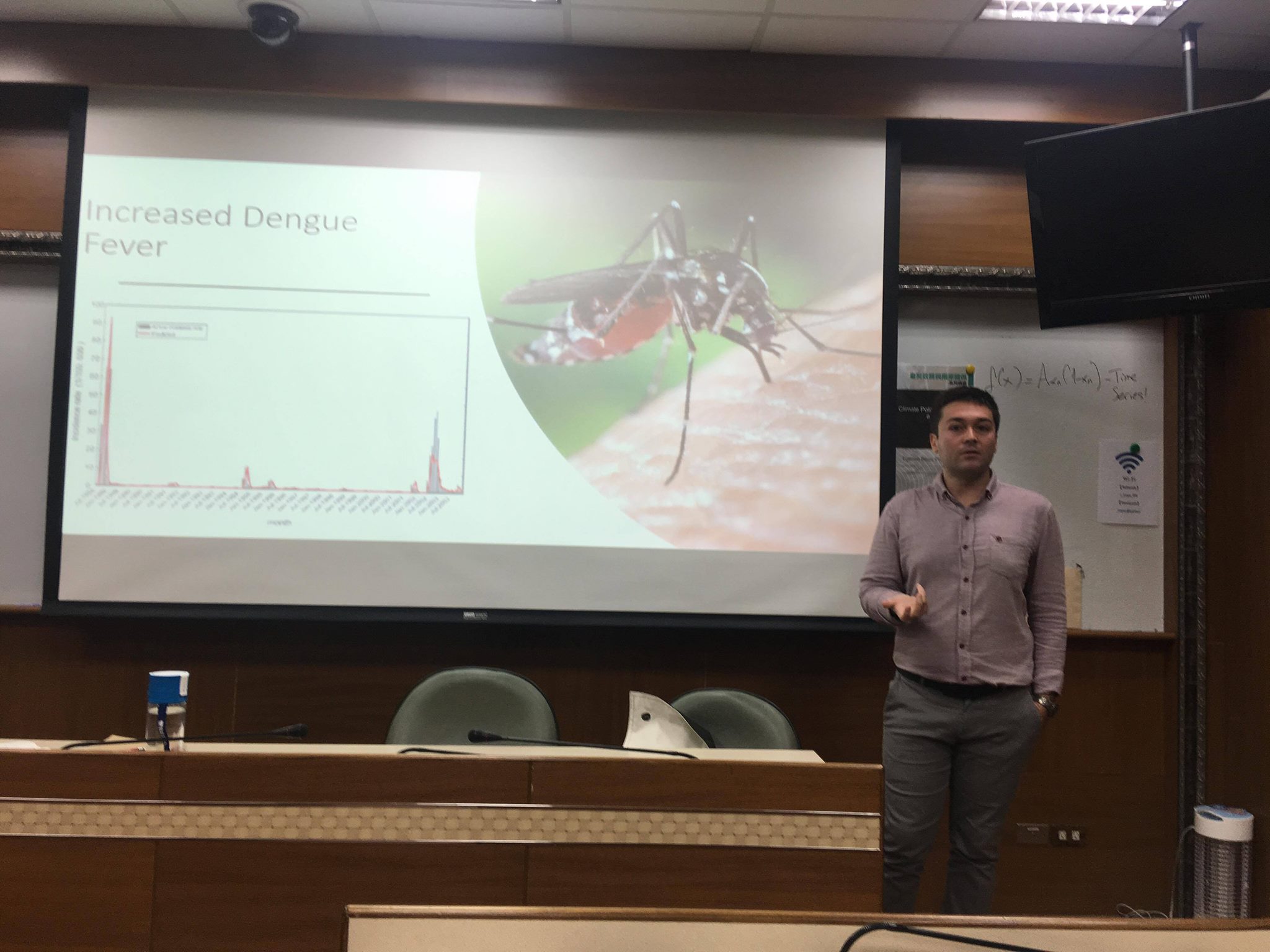 本所訪問學者Egemen Bezci博士談到氣候變遷在歷史上的變化,氣溫度上升的幅度越大,會讓地球的未來變得無法預測。在台灣內部也發生很多源於氣候換變遷的影響,包括颱風發生次數與規模變得難掌握;土石流山崩等天災更常威脅居民;水災與旱災也的發生更變幻無常;在高雄,登革熱與氣候變遷有關聯性,暖冬年更容易引發登革熱大規模爆發;墾丁的珊瑚礁也因為海水氣溫上升而受到傷害。