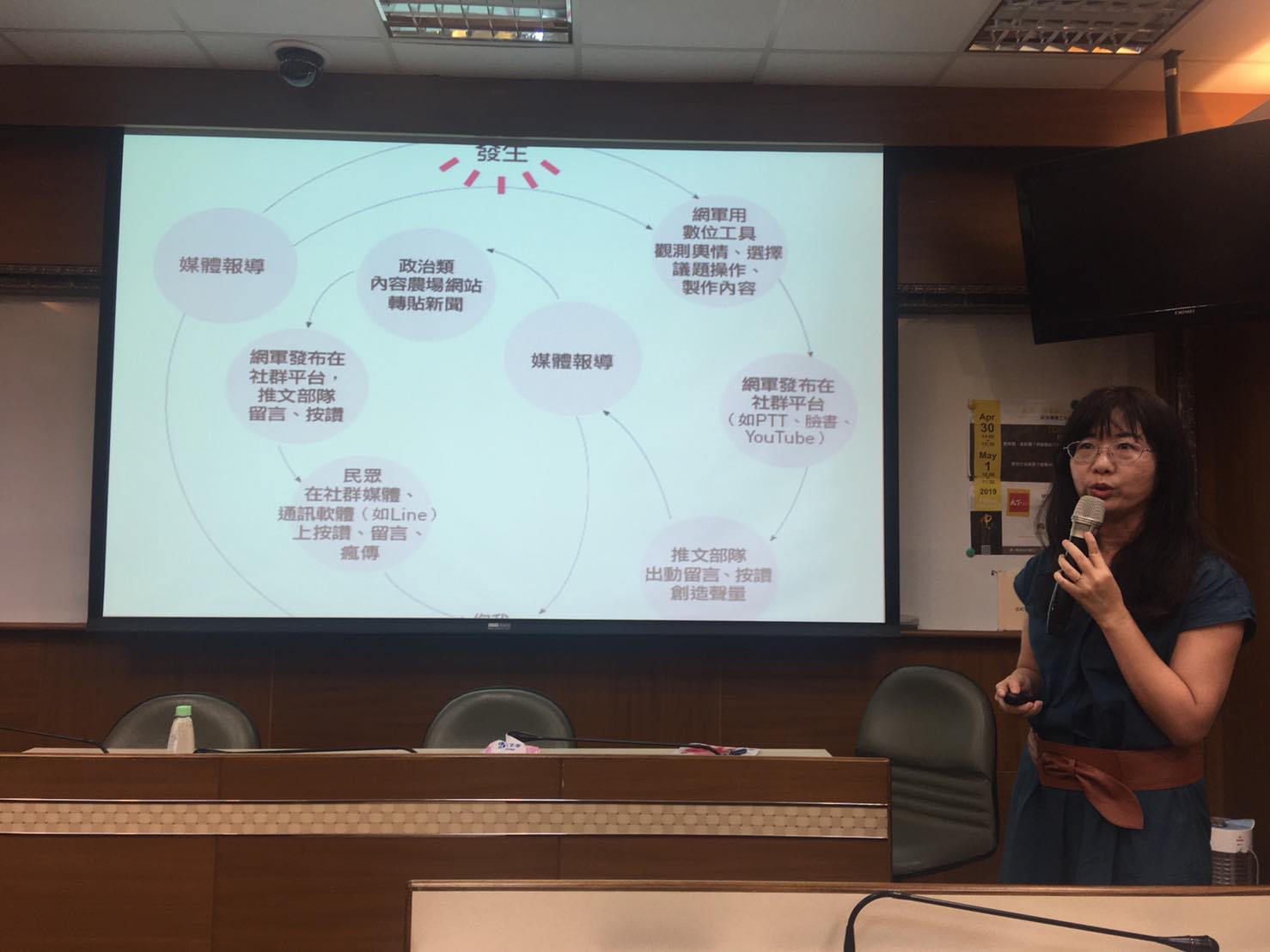 林副總一開始就投出震憾彈,指出一般記者已經會在真實事件上加工,造成半真半假的新聞,屬於「洗興論」、轉移大眾注意力的做法。她舉例,某日報記者主動在報導加上「以高雄永齡農場無毒有機產品為優先採購對象」造成當事人不得不開記者會撇清,又如去年總統乘雲豹車勘災之外其實有下水徒步勘災,卻被報導為不下車不涉水。又如2018年有心人在辯論會時在ppt上質疑陳其邁戴耳機,造成了當天下午一點開始到隔天下午被澄清為止,大家對辯論內容的注意力及興趣都已被轉移殆盡,這樣的注意力移轉「工程」,再向上升級就會出現假興論與假共識。